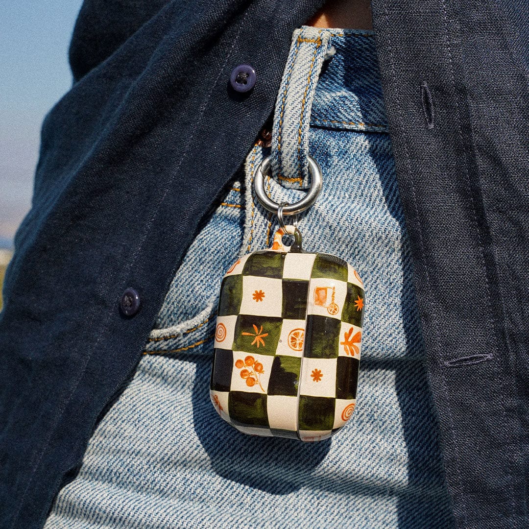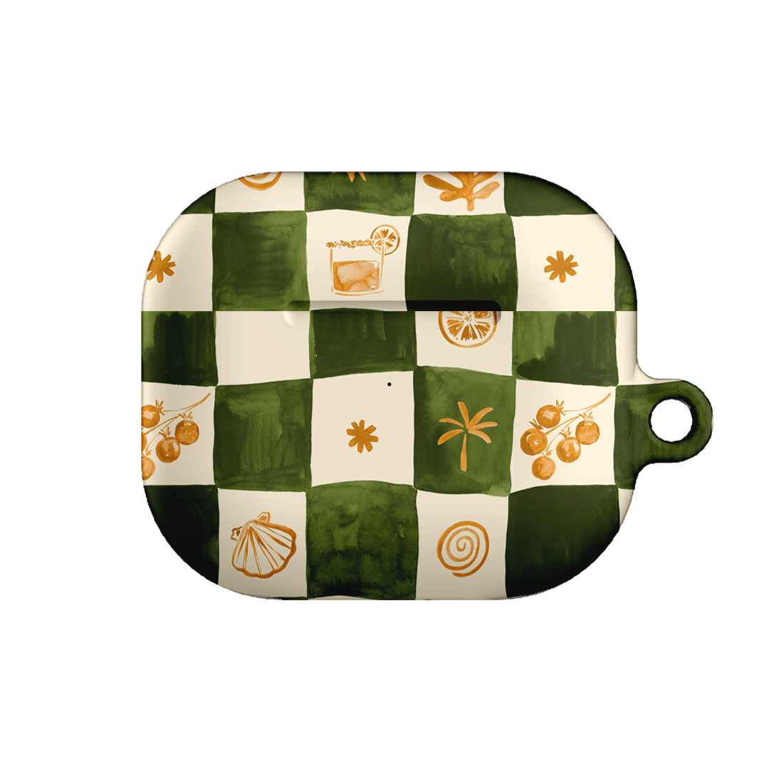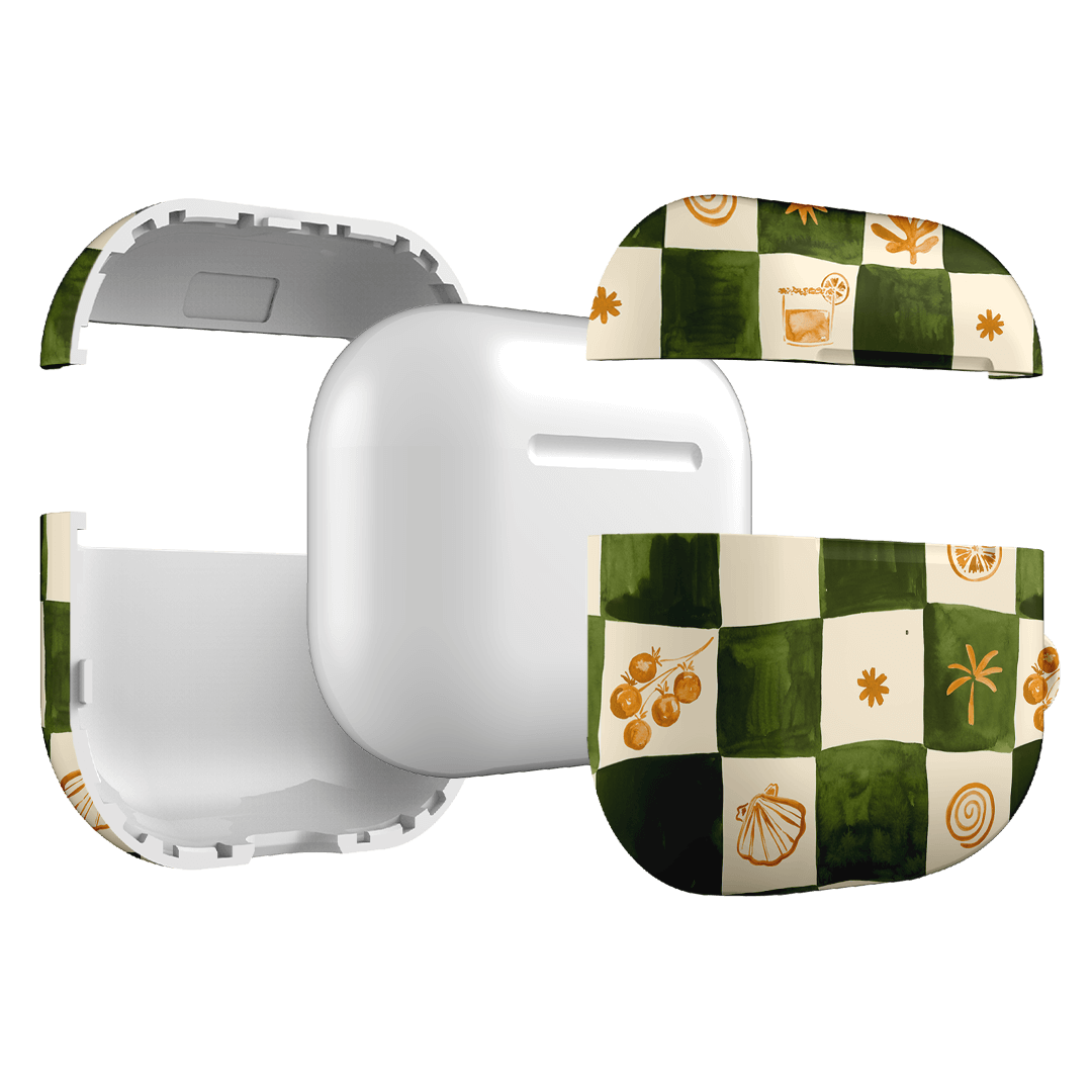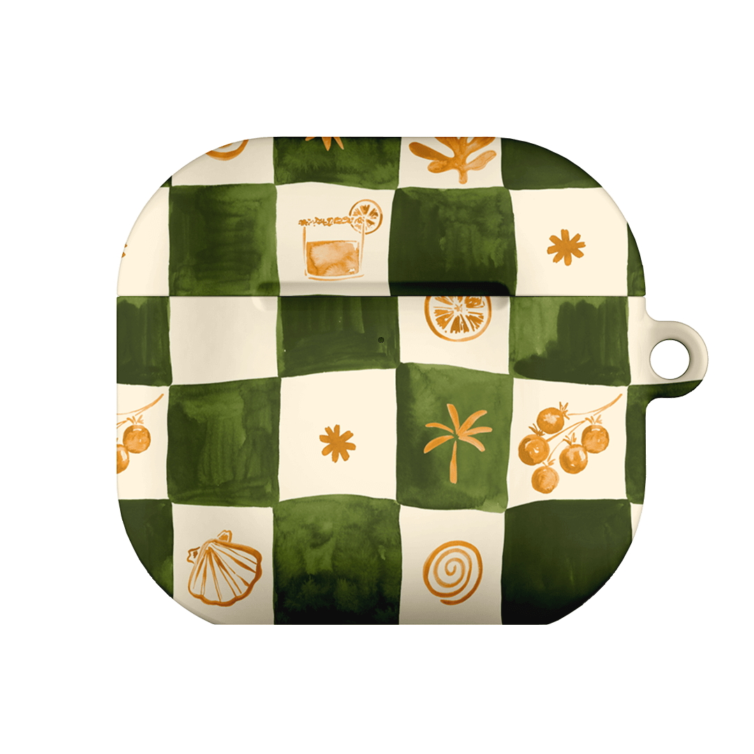 Savour laid-back coastal vibes with the Afternoon Mezze AirPods case from the Life of the Sun collection by Charlie Taylor. Infused with the essence of breezy beachside moments, this design features a soft green and cream checkerboard pattern adorned with delicate seaside-inspired details. It captures a relaxed, nostalgic charm that feels both timeless and playful, perfect for long lunches, sunlit strolls, and summer reverie.