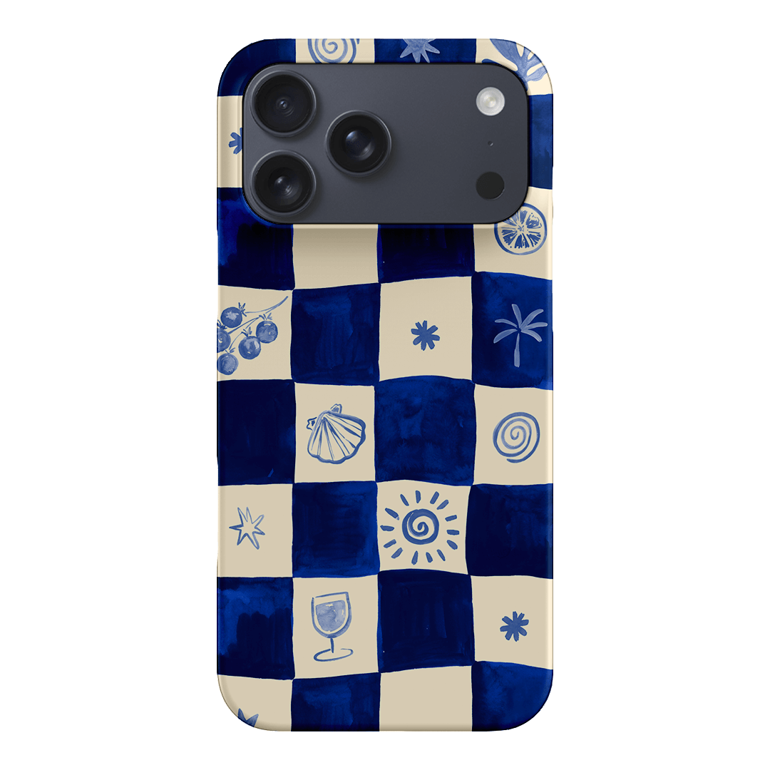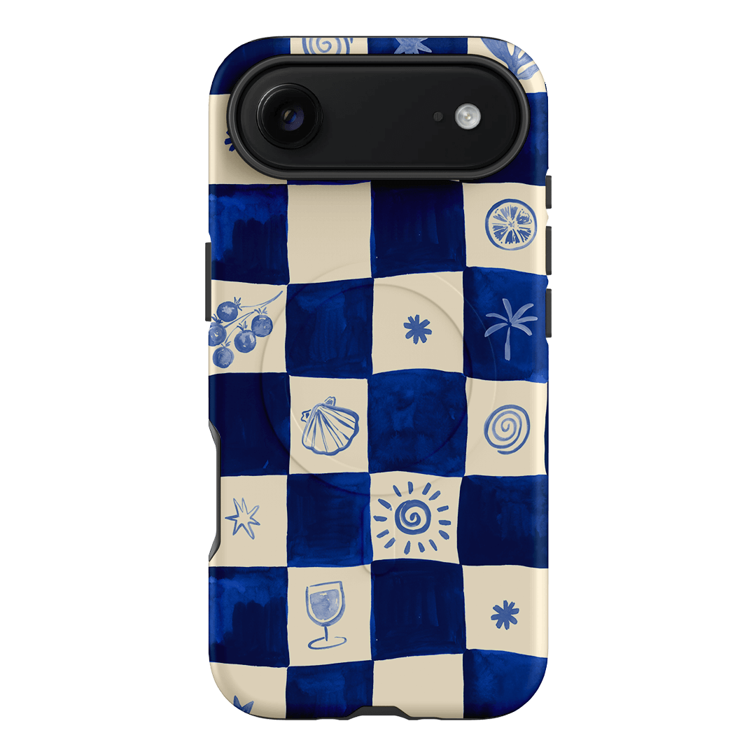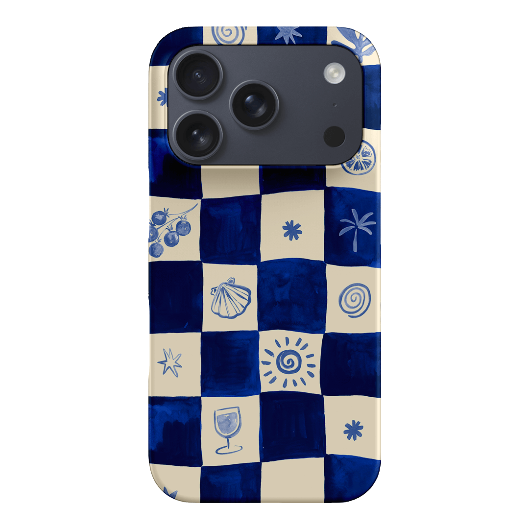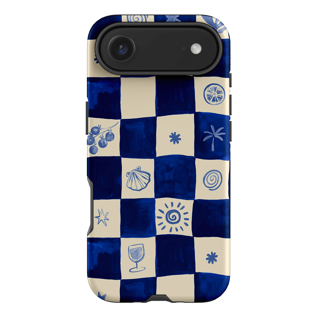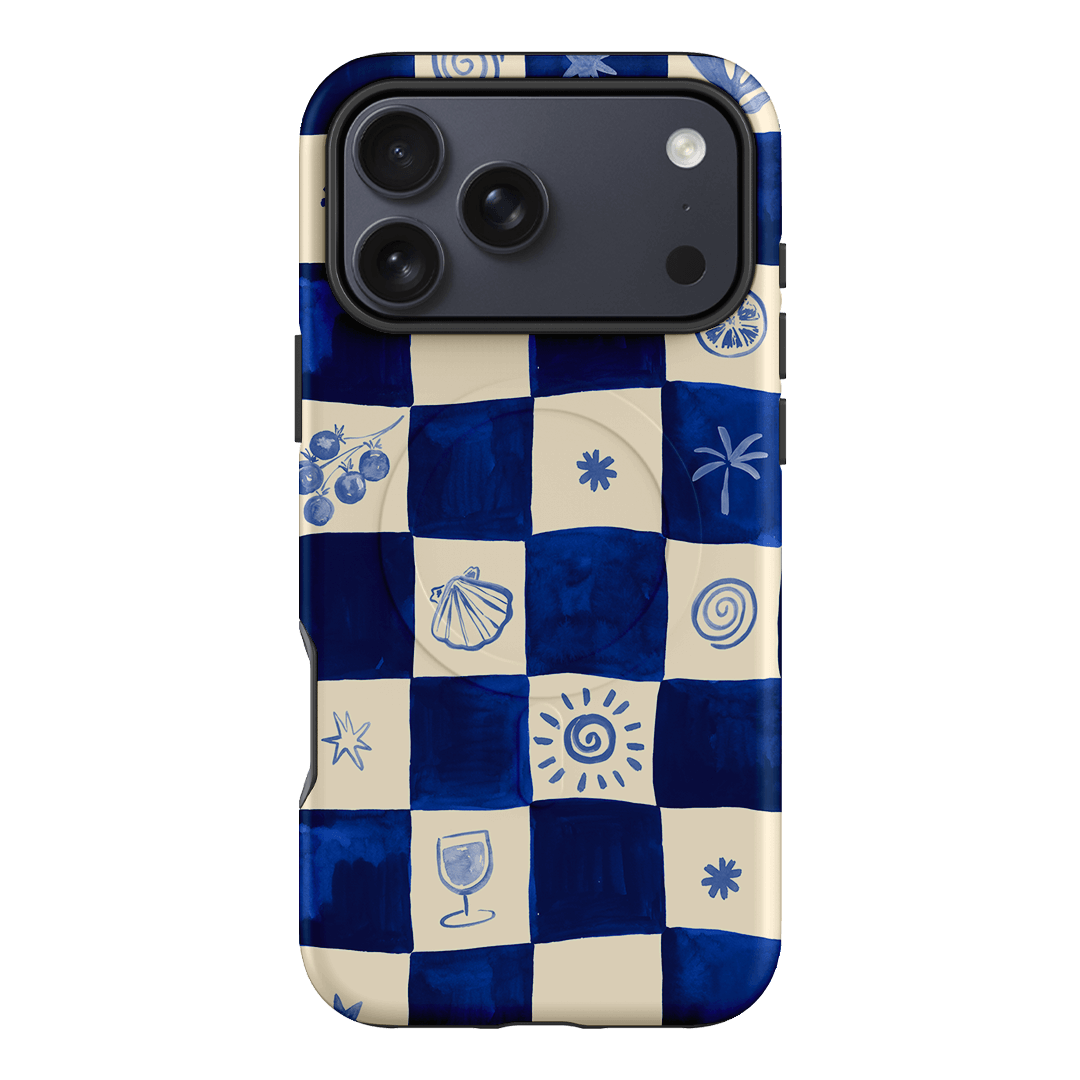 Dive into the dreamy depths of seaside bliss with the Afternoon Mezze Azure case from the Life of the Sun collection by Charlie Taylor. A moody twist on the original’s breezy charm, this version swaps sunlit greens for rich, dark ocean blues, like the last glow of daylight melting into twilight over the horizon. Its checkerboard pattern in deep azure and cream is scattered with subtle coastal details, evoking salty air, beachside picnics, and that first sip of something chilled as the sky turns navy.