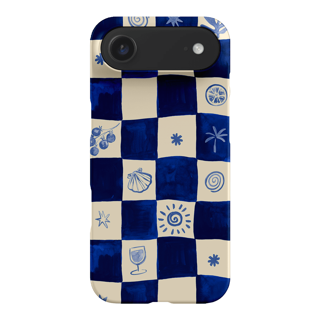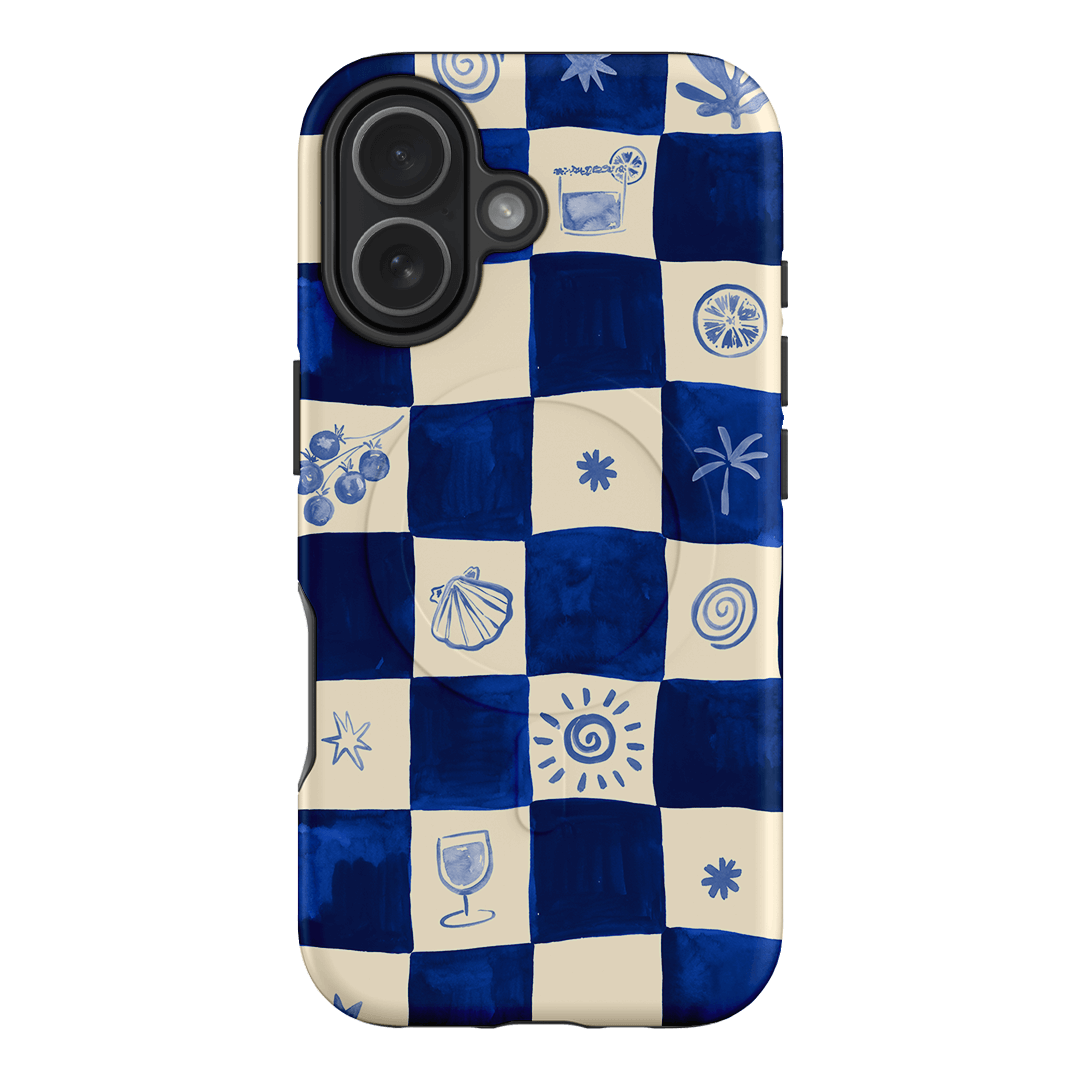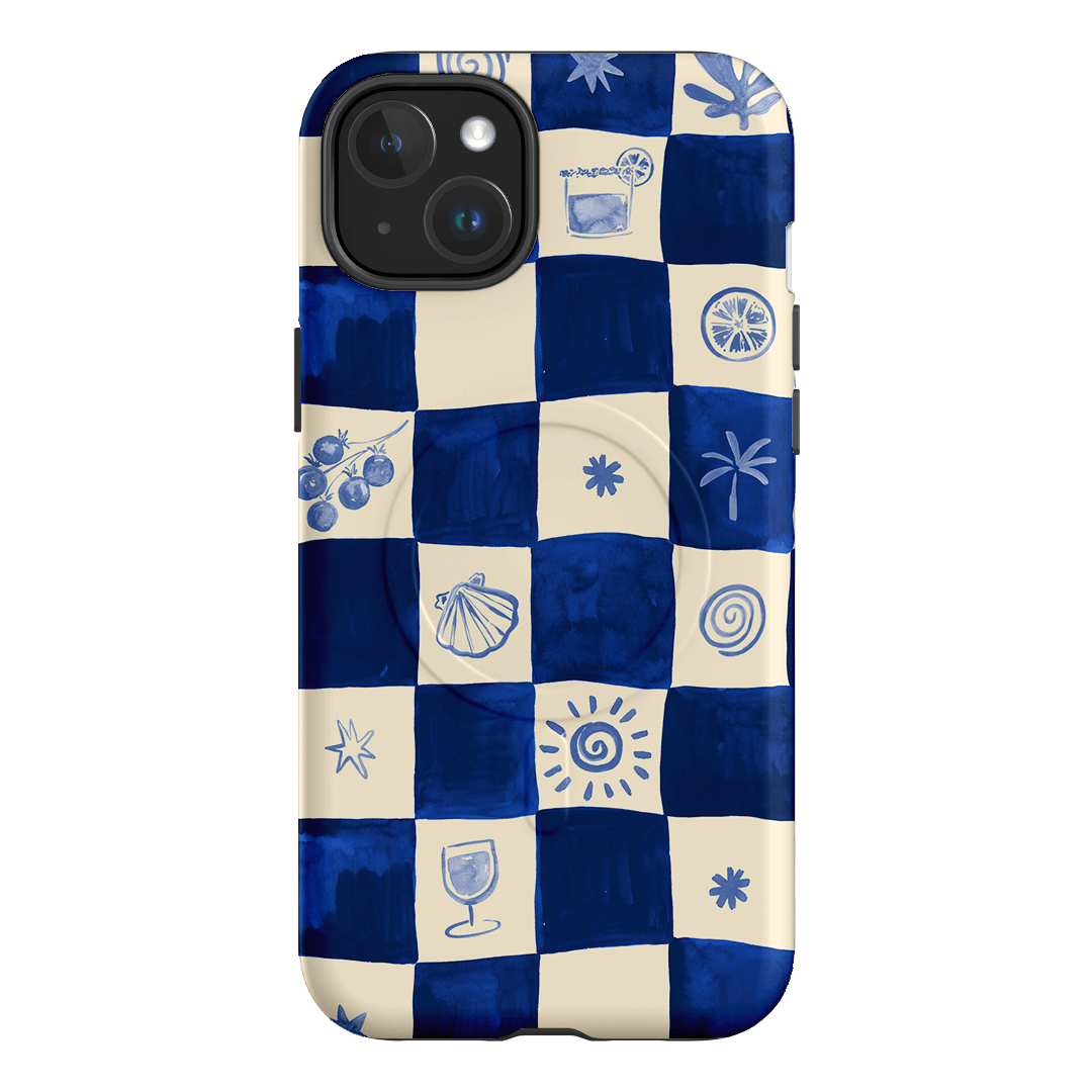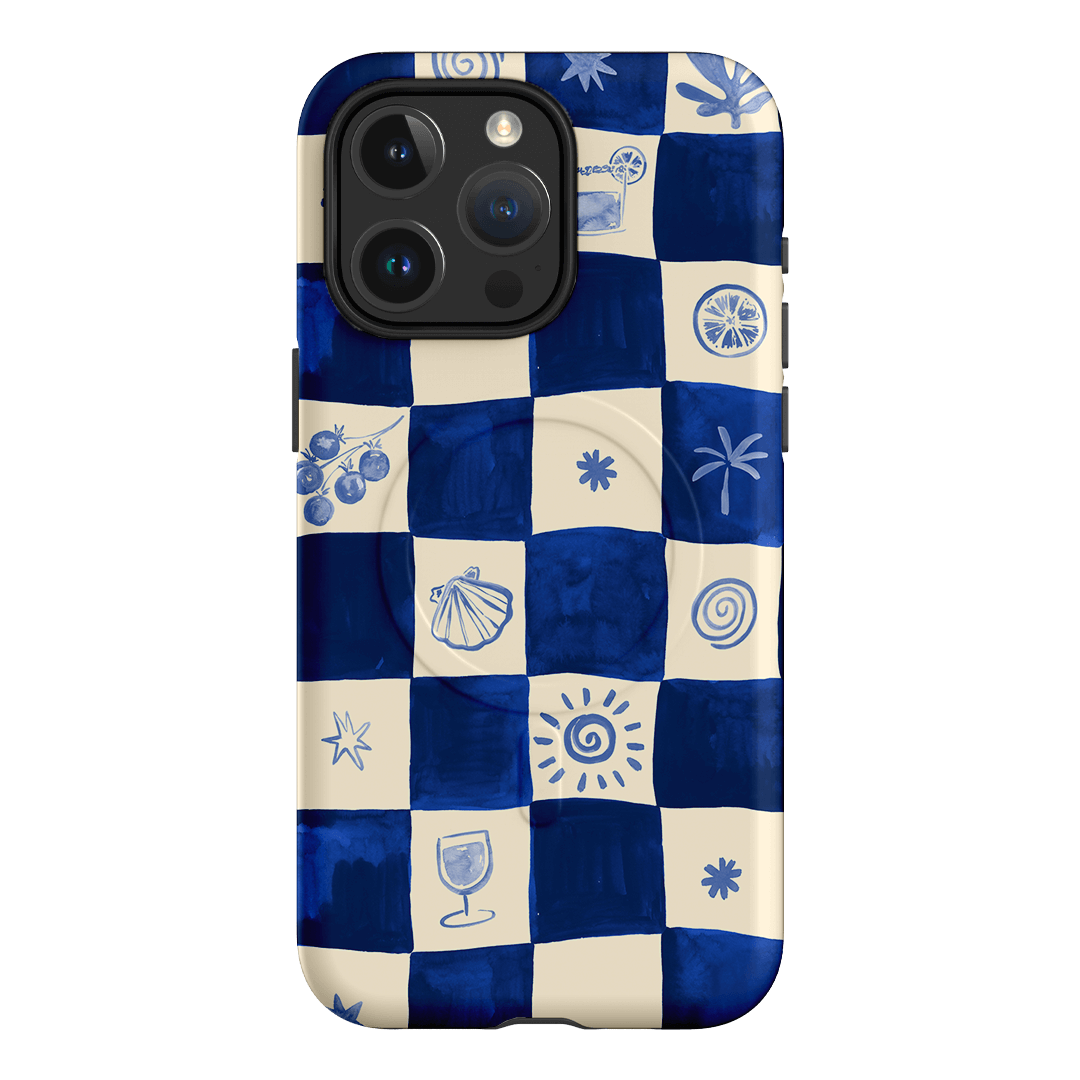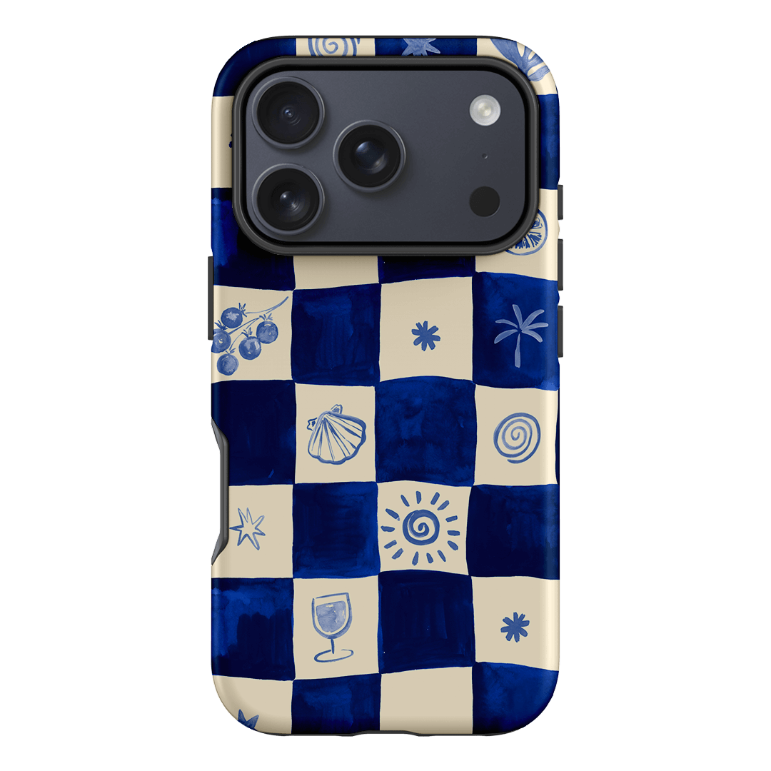 Dive into the dreamy depths of seaside bliss with the Afternoon Mezze Azure case from the Life of the Sun collection by Charlie Taylor. A moody twist on the original’s breezy charm, this version swaps sunlit greens for rich, dark ocean blues, like the last glow of daylight melting into twilight over the horizon. Its checkerboard pattern in deep azure and cream is scattered with subtle coastal details, evoking salty air, beachside picnics, and that first sip of something chilled as the sky turns navy.