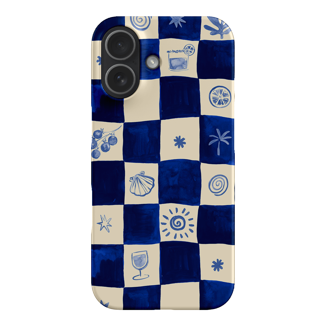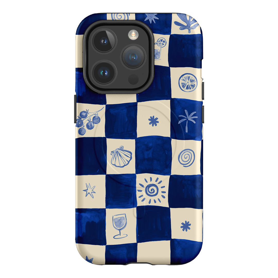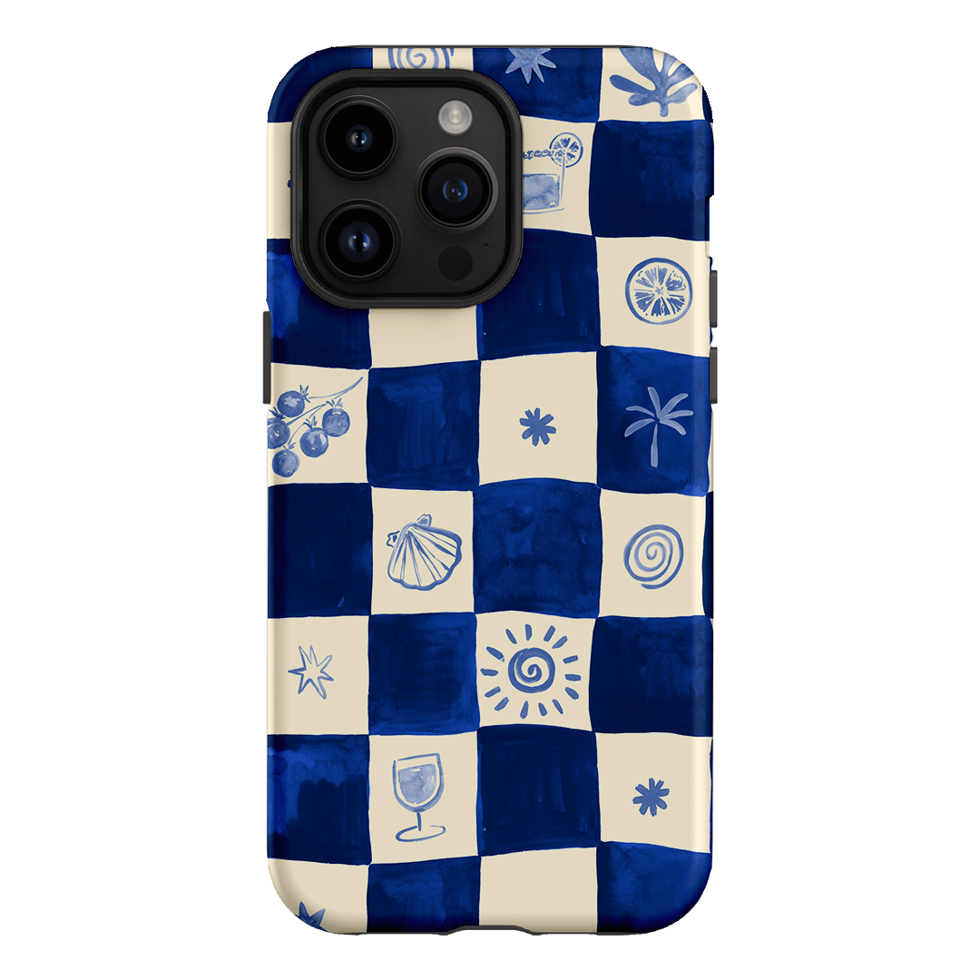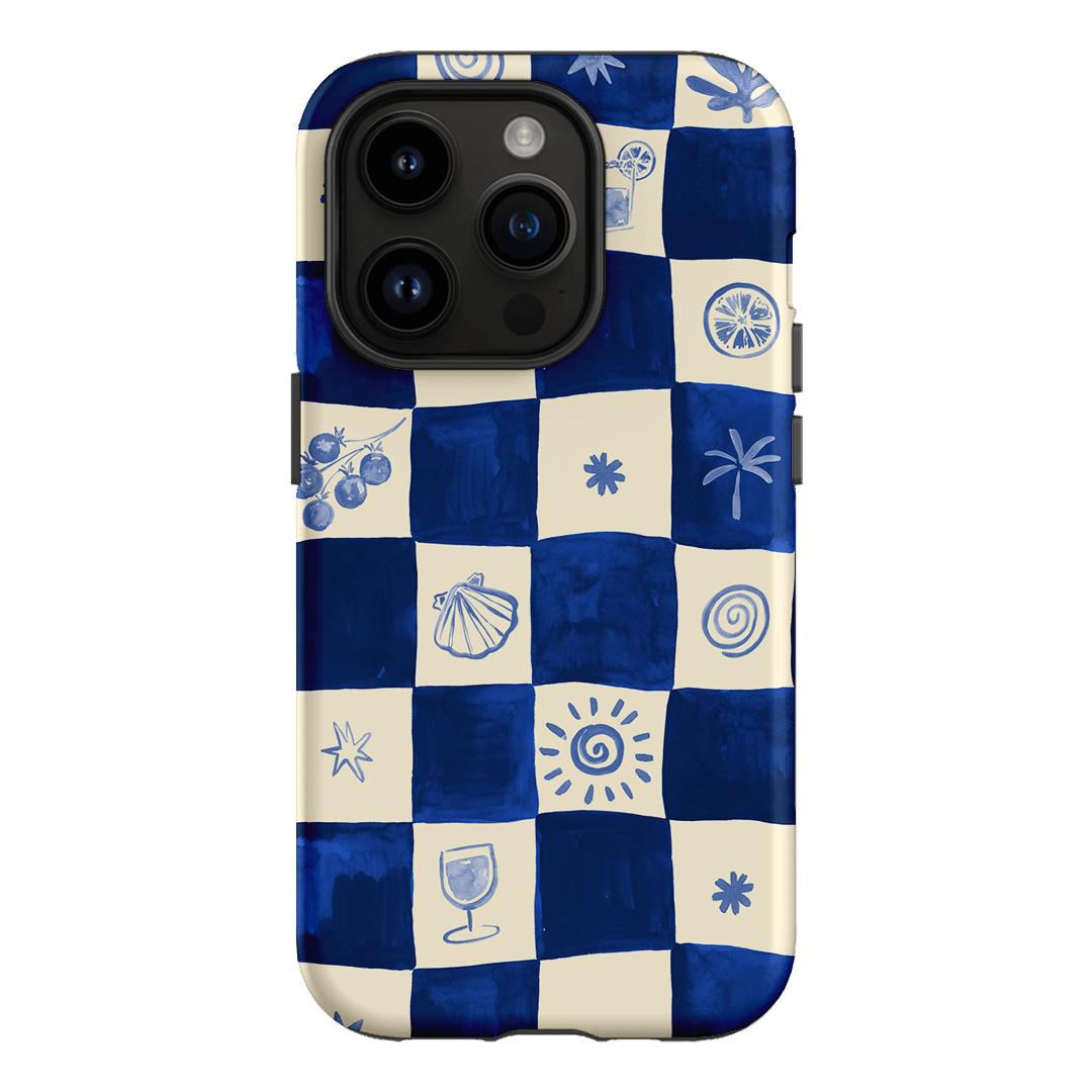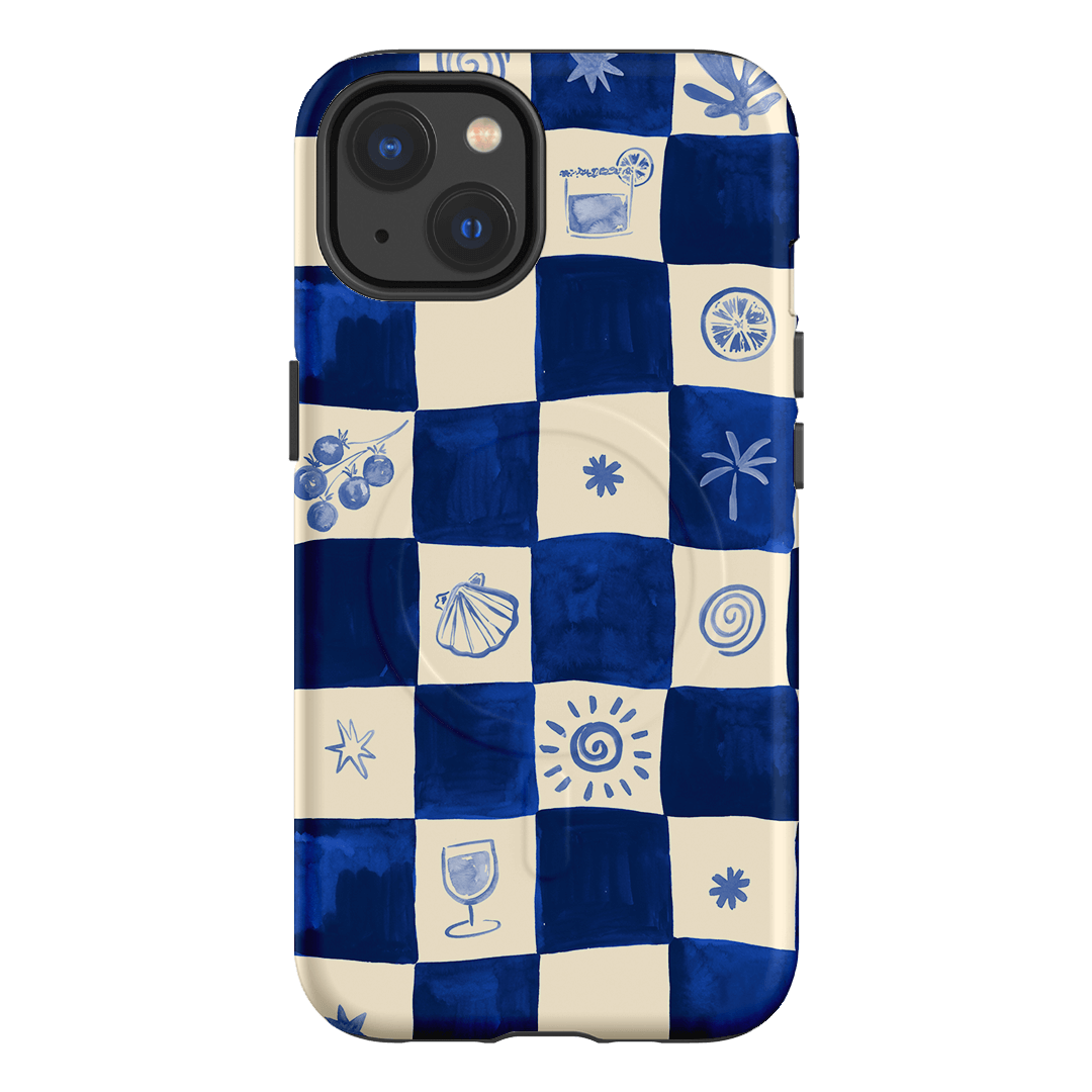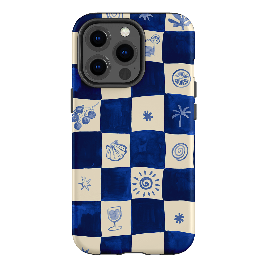 Dive into the dreamy depths of seaside bliss with the Afternoon Mezze Azure case from the Life of the Sun collection by Charlie Taylor. A moody twist on the original’s breezy charm, this version swaps sunlit greens for rich, dark ocean blues, like the last glow of daylight melting into twilight over the horizon. Its checkerboard pattern in deep azure and cream is scattered with subtle coastal details, evoking salty air, beachside picnics, and that first sip of something chilled as the sky turns navy.