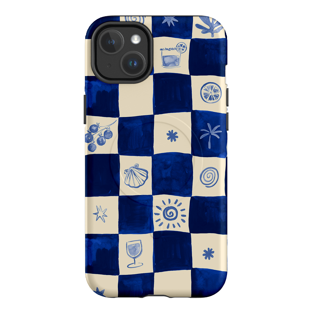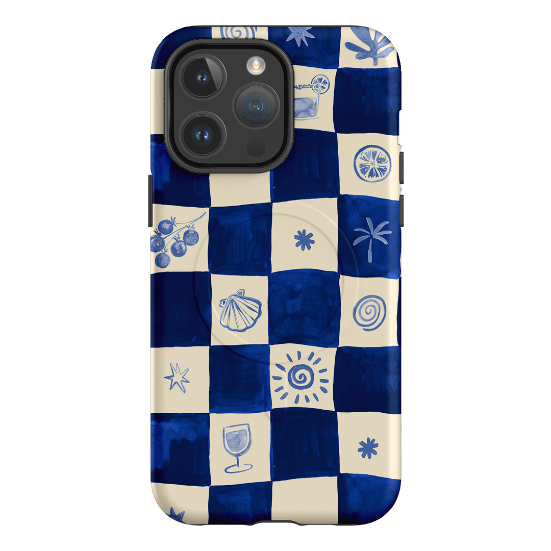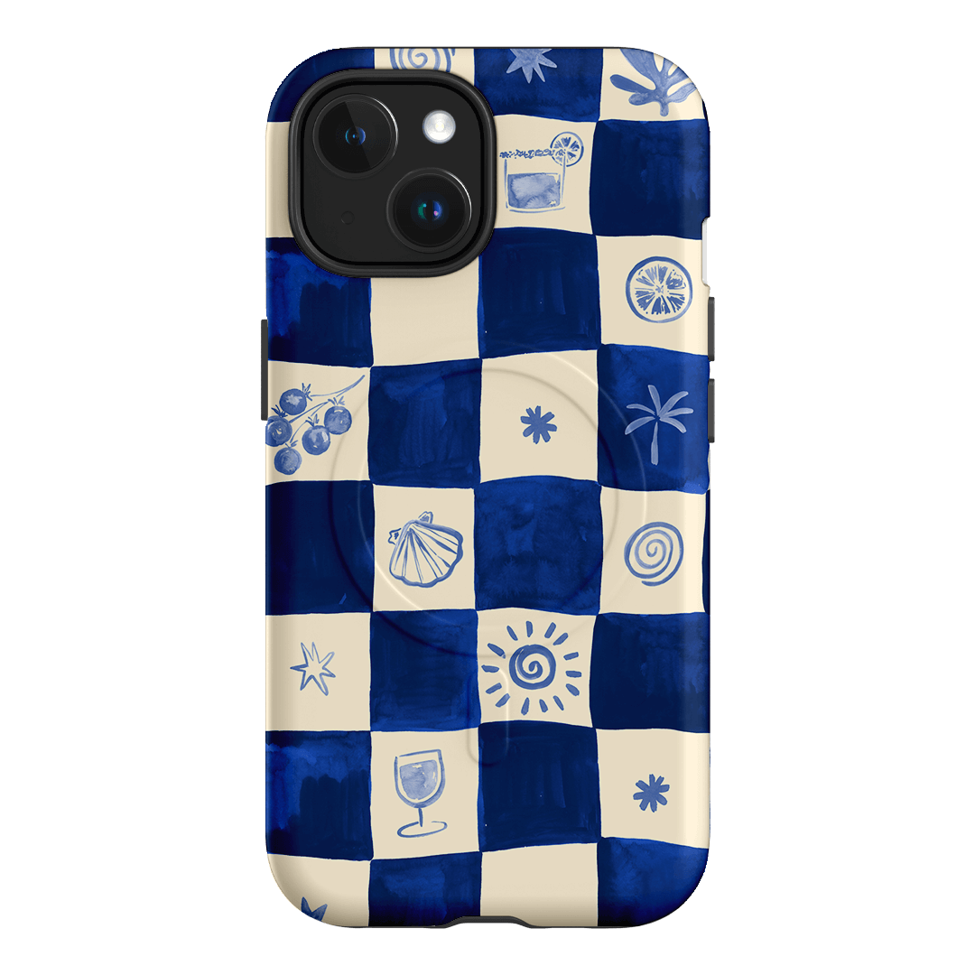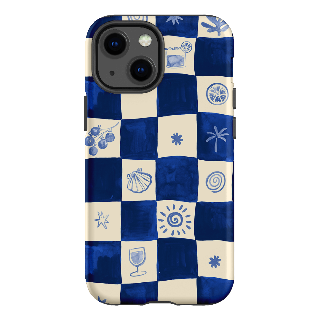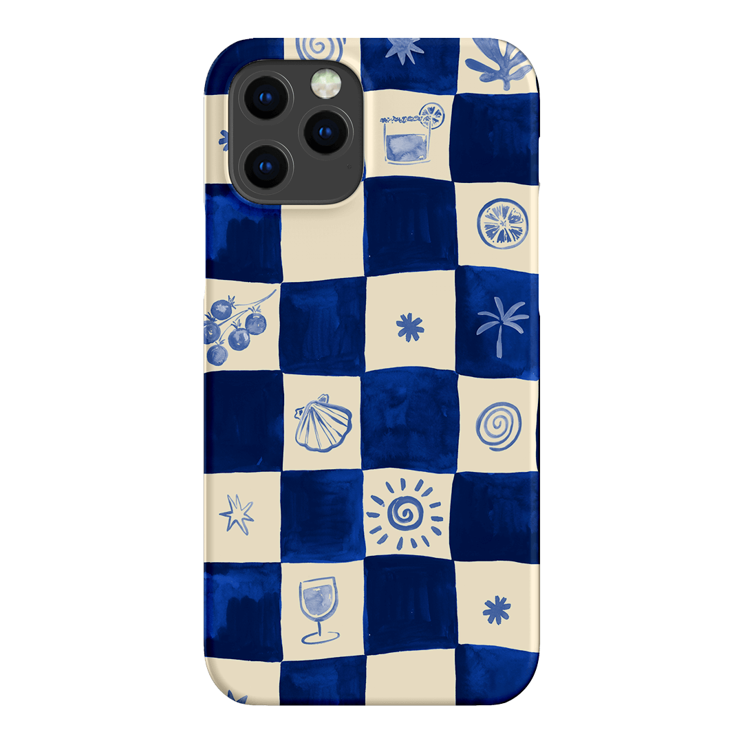 Dive into the dreamy depths of seaside bliss with the Afternoon Mezze Azure case from the Life of the Sun collection by Charlie Taylor. A moody twist on the original’s breezy charm, this version swaps sunlit greens for rich, dark ocean blues, like the last glow of daylight melting into twilight over the horizon. Its checkerboard pattern in deep azure and cream is scattered with subtle coastal details, evoking salty air, beachside picnics, and that first sip of something chilled as the sky turns navy.