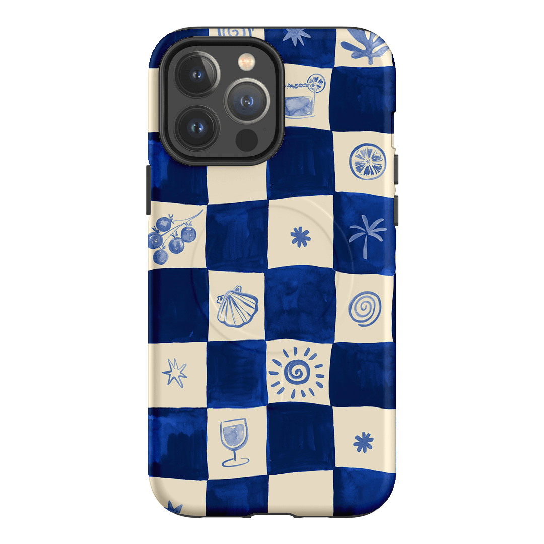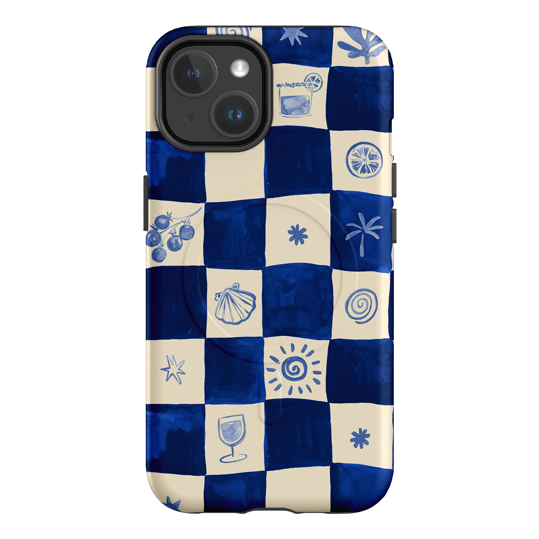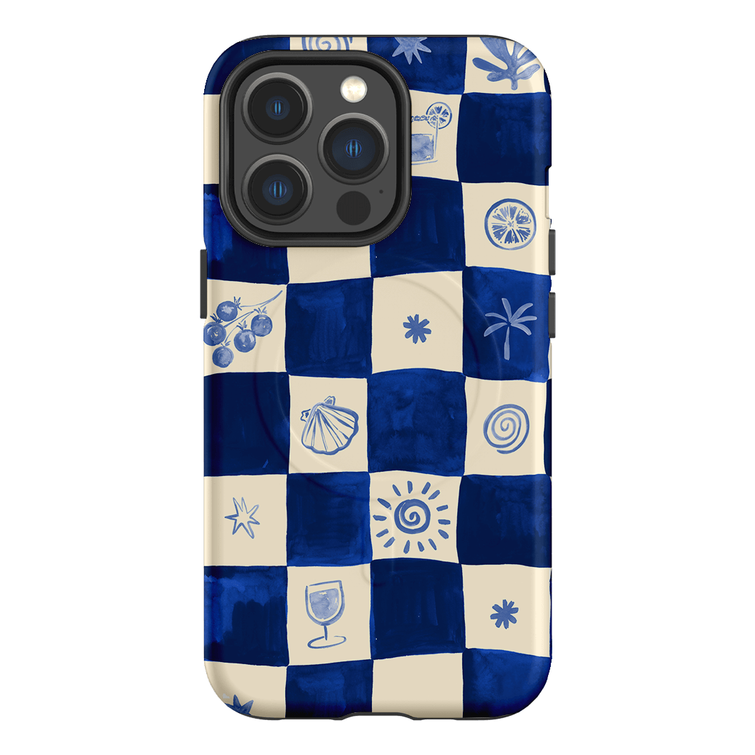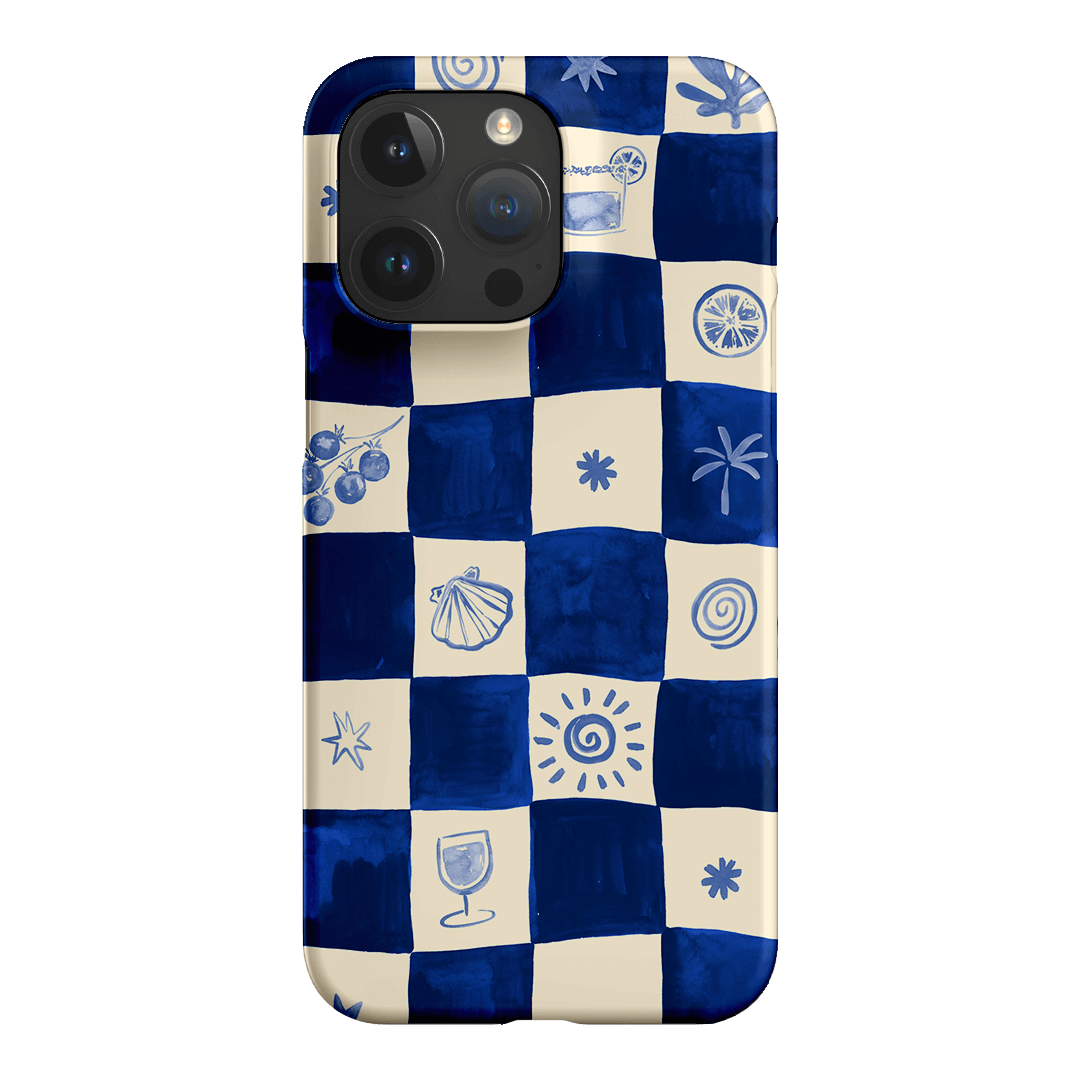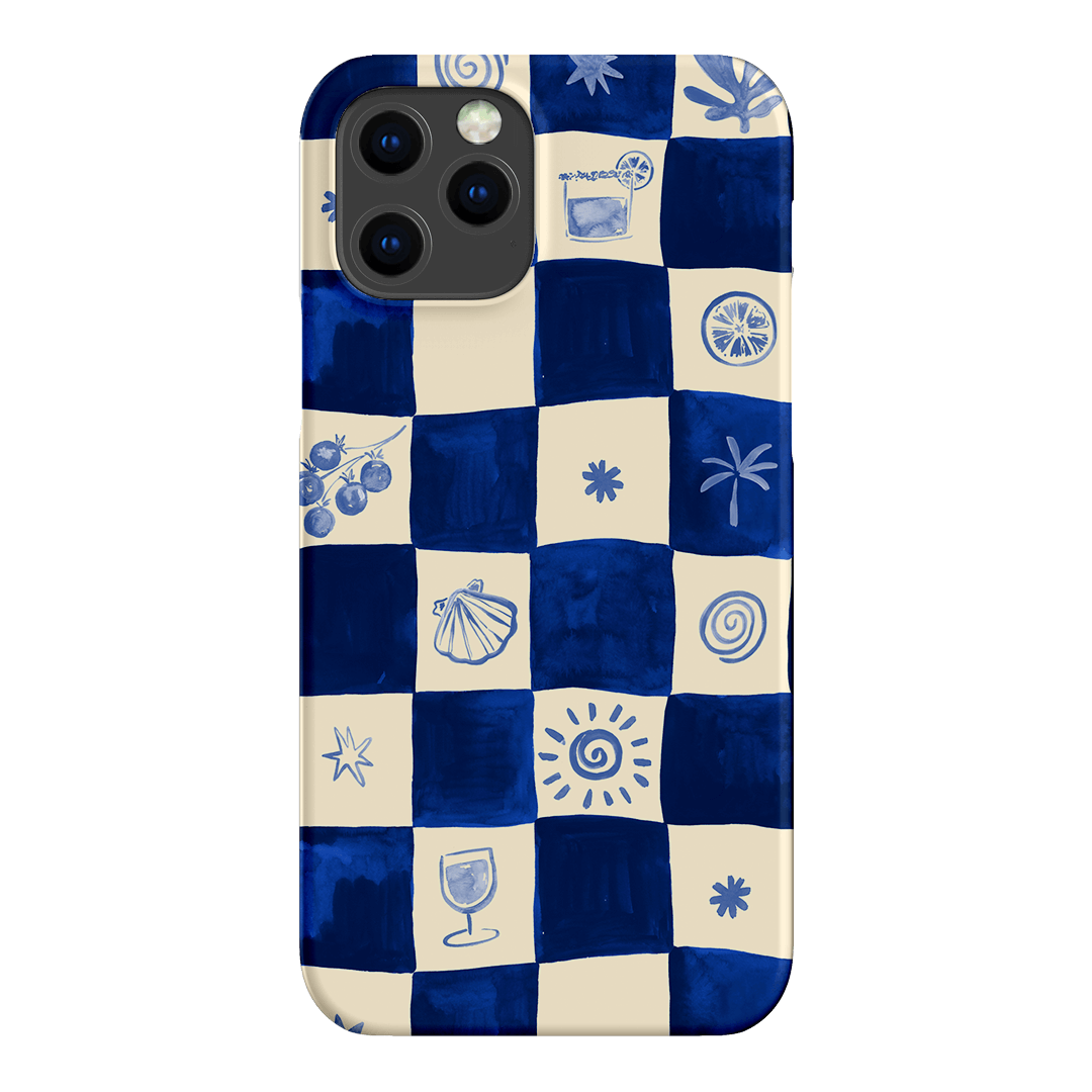 Dive into the dreamy depths of seaside bliss with the Afternoon Mezze Azure case from the Life of the Sun collection by Charlie Taylor. A moody twist on the original’s breezy charm, this version swaps sunlit greens for rich, dark ocean blues, like the last glow of daylight melting into twilight over the horizon. Its checkerboard pattern in deep azure and cream is scattered with subtle coastal details, evoking salty air, beachside picnics, and that first sip of something chilled as the sky turns navy.