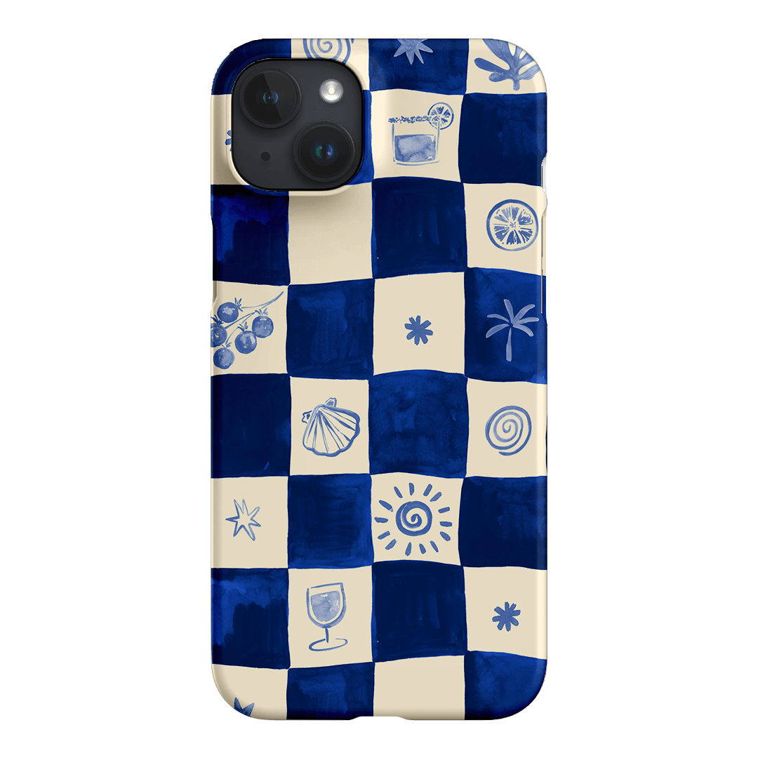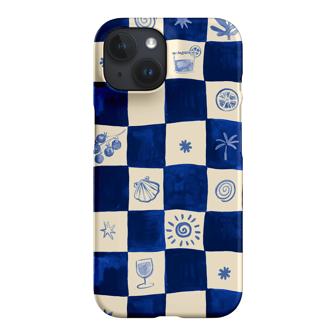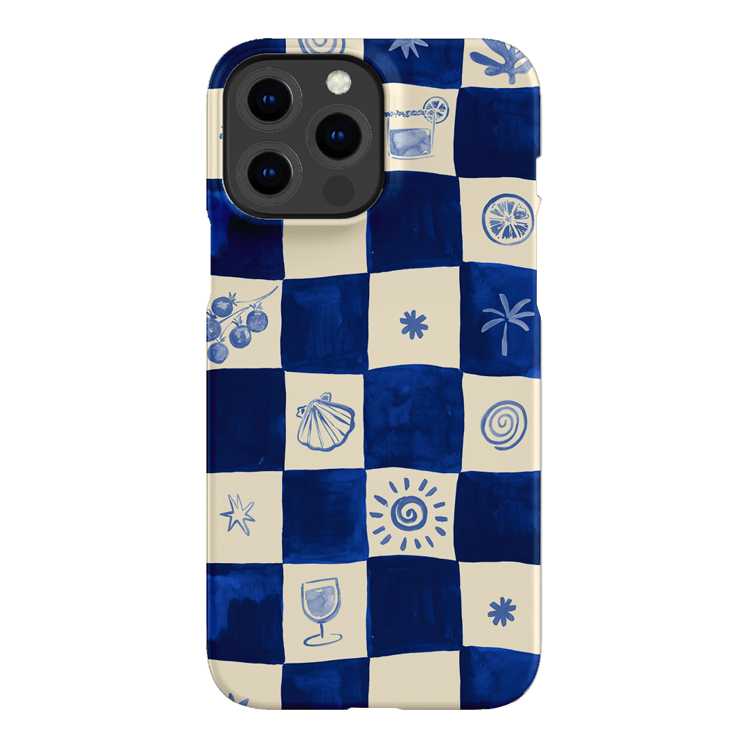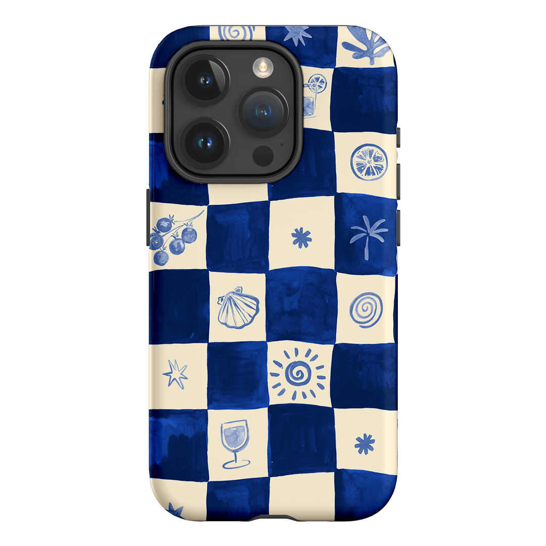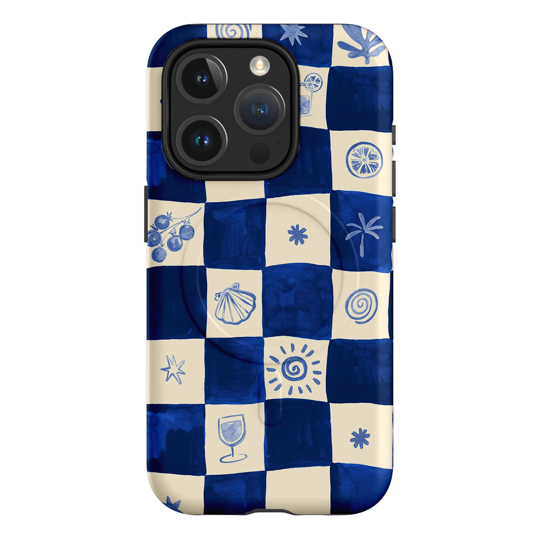 Dive into the dreamy depths of seaside bliss with the Afternoon Mezze Azure case from the Life of the Sun collection by Charlie Taylor. A moody twist on the original’s breezy charm, this version swaps sunlit greens for rich, dark ocean blues, like the last glow of daylight melting into twilight over the horizon. Its checkerboard pattern in deep azure and cream is scattered with subtle coastal details, evoking salty air, beachside picnics, and that first sip of something chilled as the sky turns navy.