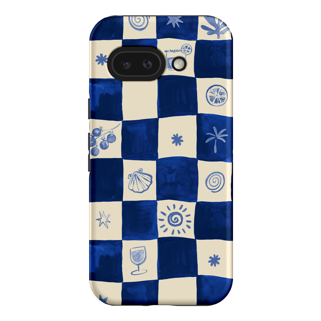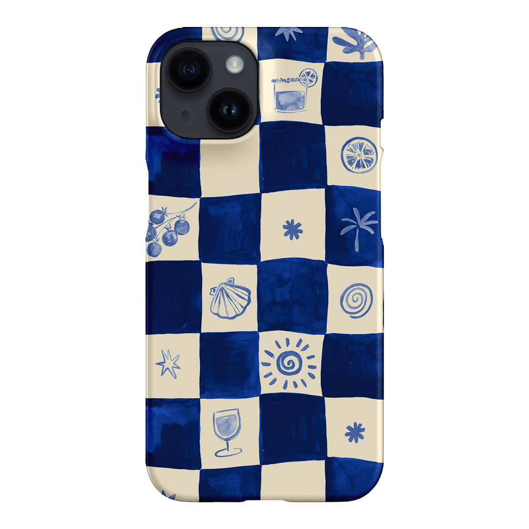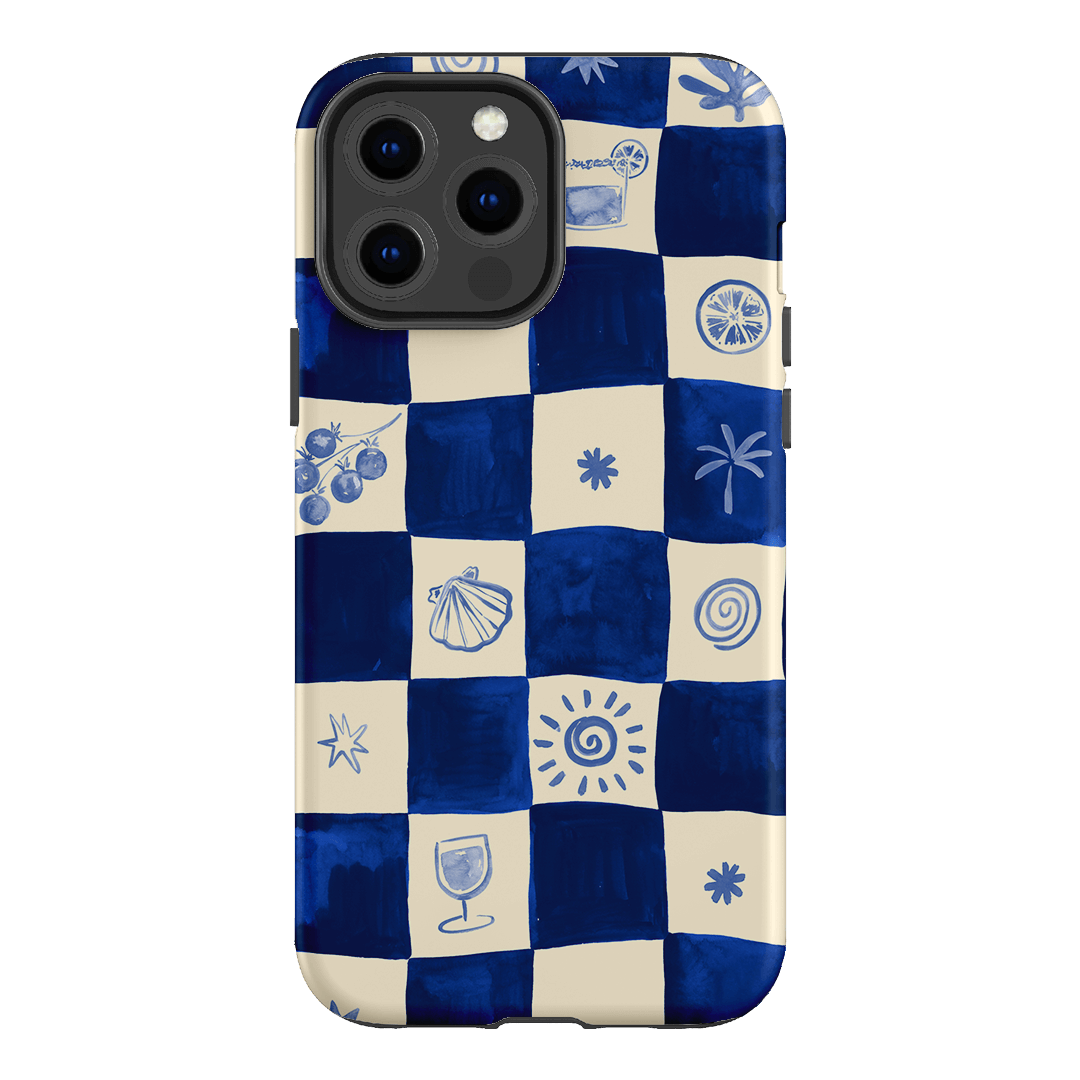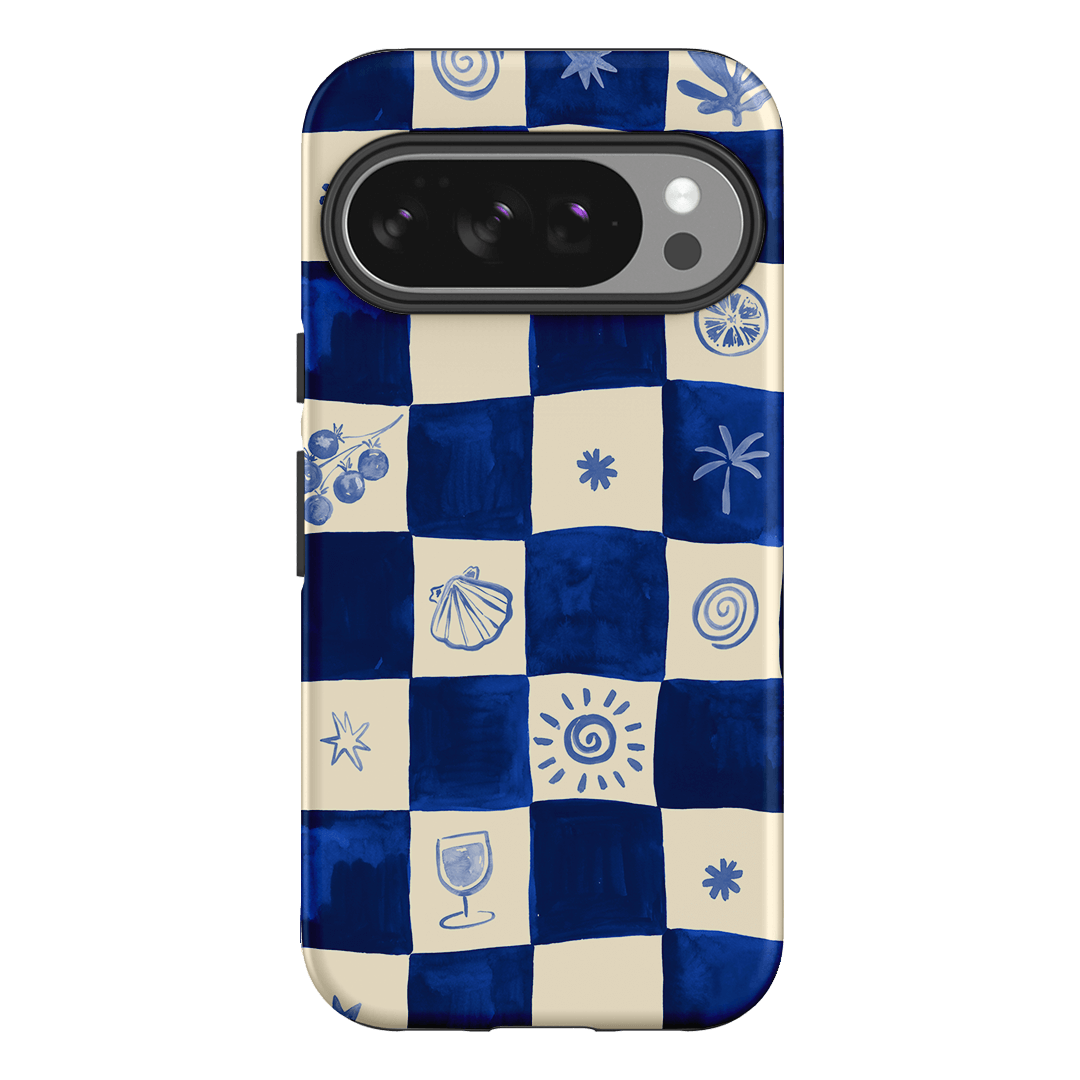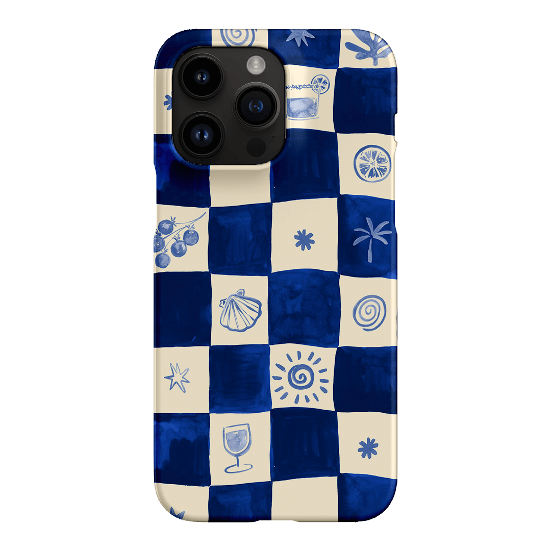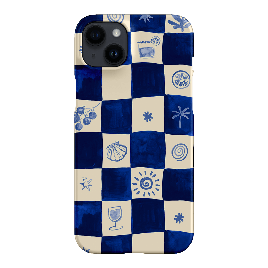 Dive into the dreamy depths of seaside bliss with the Afternoon Mezze Azure case from the Life of the Sun collection by Charlie Taylor. A moody twist on the original’s breezy charm, this version swaps sunlit greens for rich, dark ocean blues, like the last glow of daylight melting into twilight over the horizon. Its checkerboard pattern in deep azure and cream is scattered with subtle coastal details, evoking salty air, beachside picnics, and that first sip of something chilled as the sky turns navy.