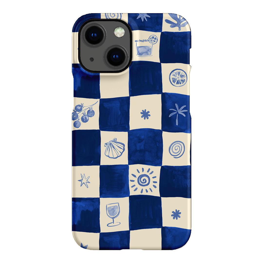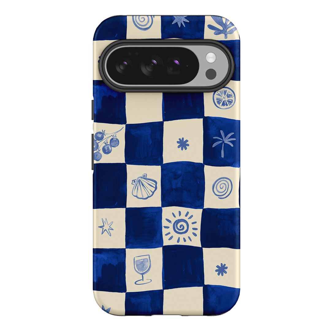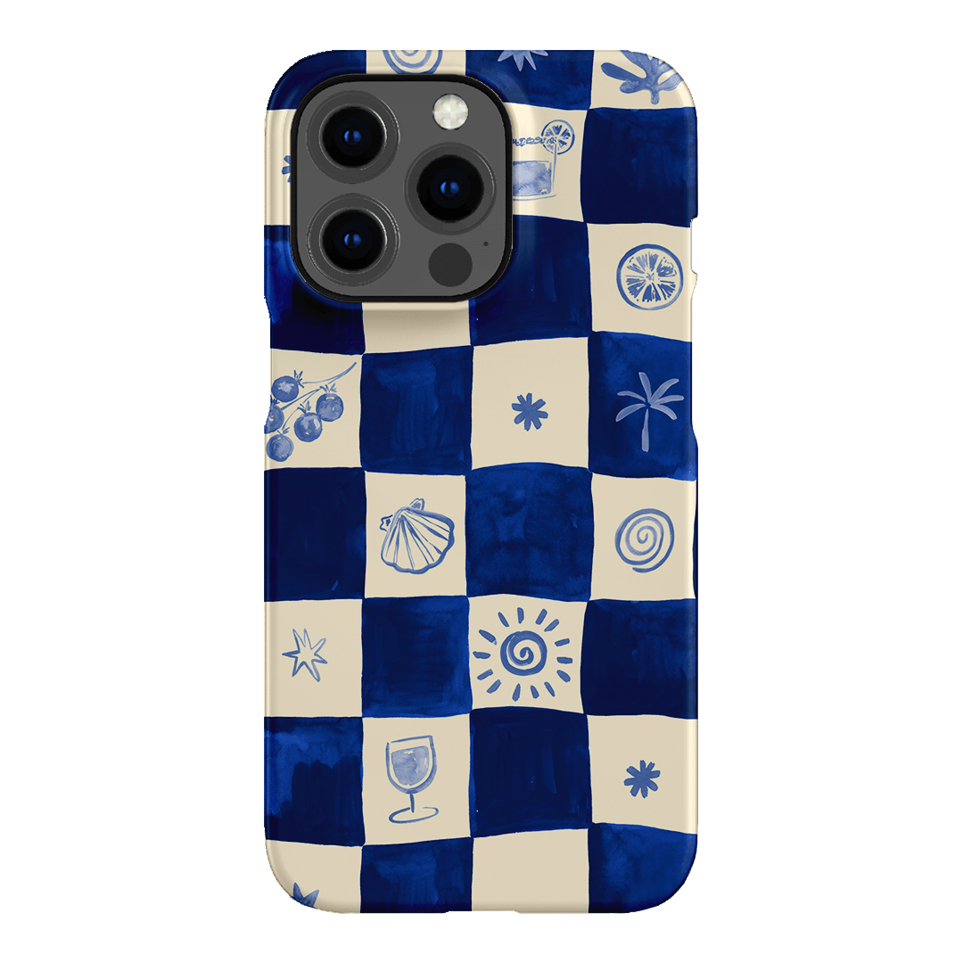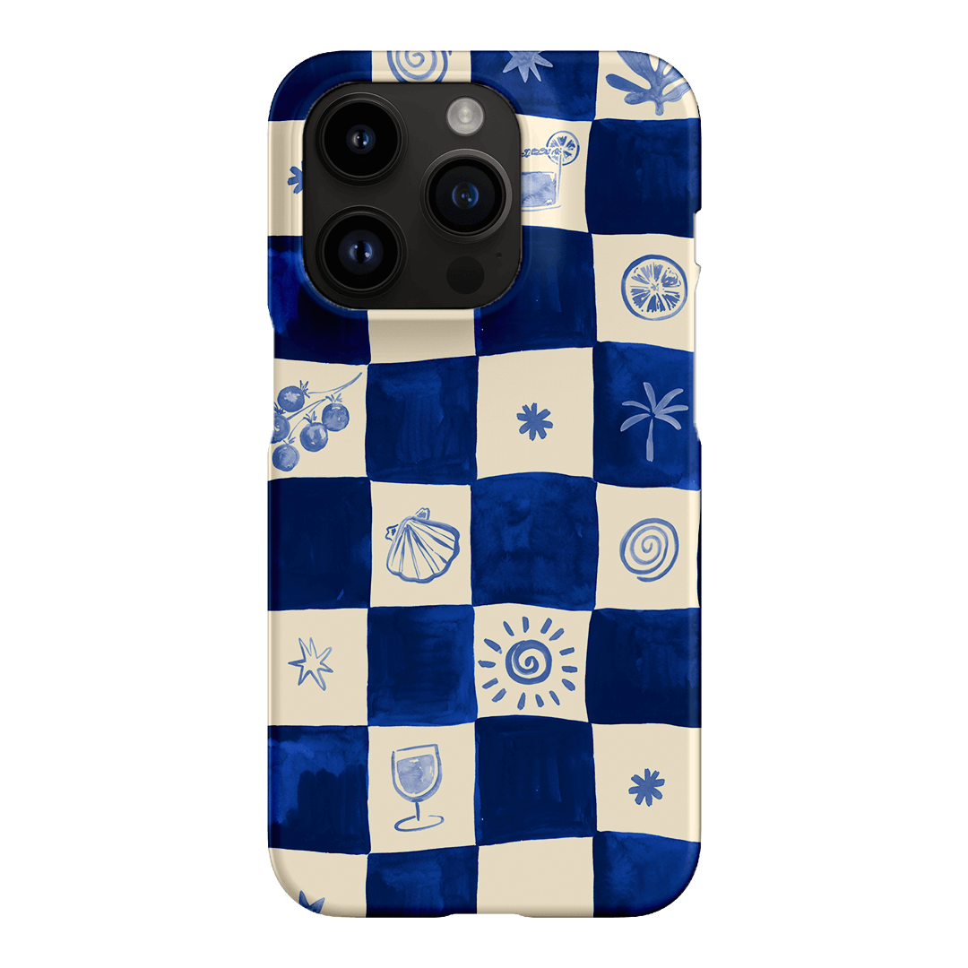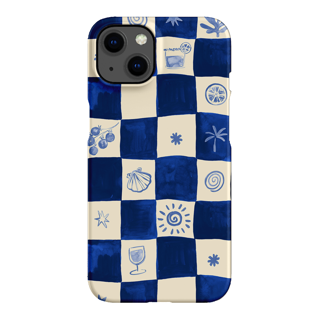 Dive into the dreamy depths of seaside bliss with the Afternoon Mezze Azure case from the Life of the Sun collection by Charlie Taylor. A moody twist on the original’s breezy charm, this version swaps sunlit greens for rich, dark ocean blues, like the last glow of daylight melting into twilight over the horizon. Its checkerboard pattern in deep azure and cream is scattered with subtle coastal details, evoking salty air, beachside picnics, and that first sip of something chilled as the sky turns navy.