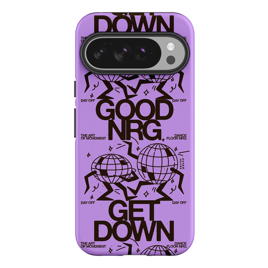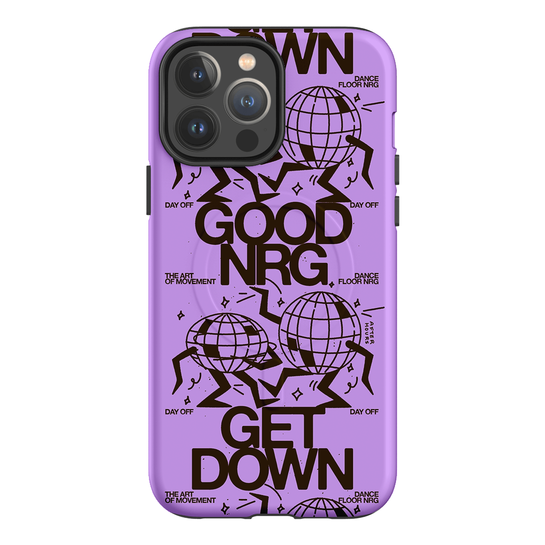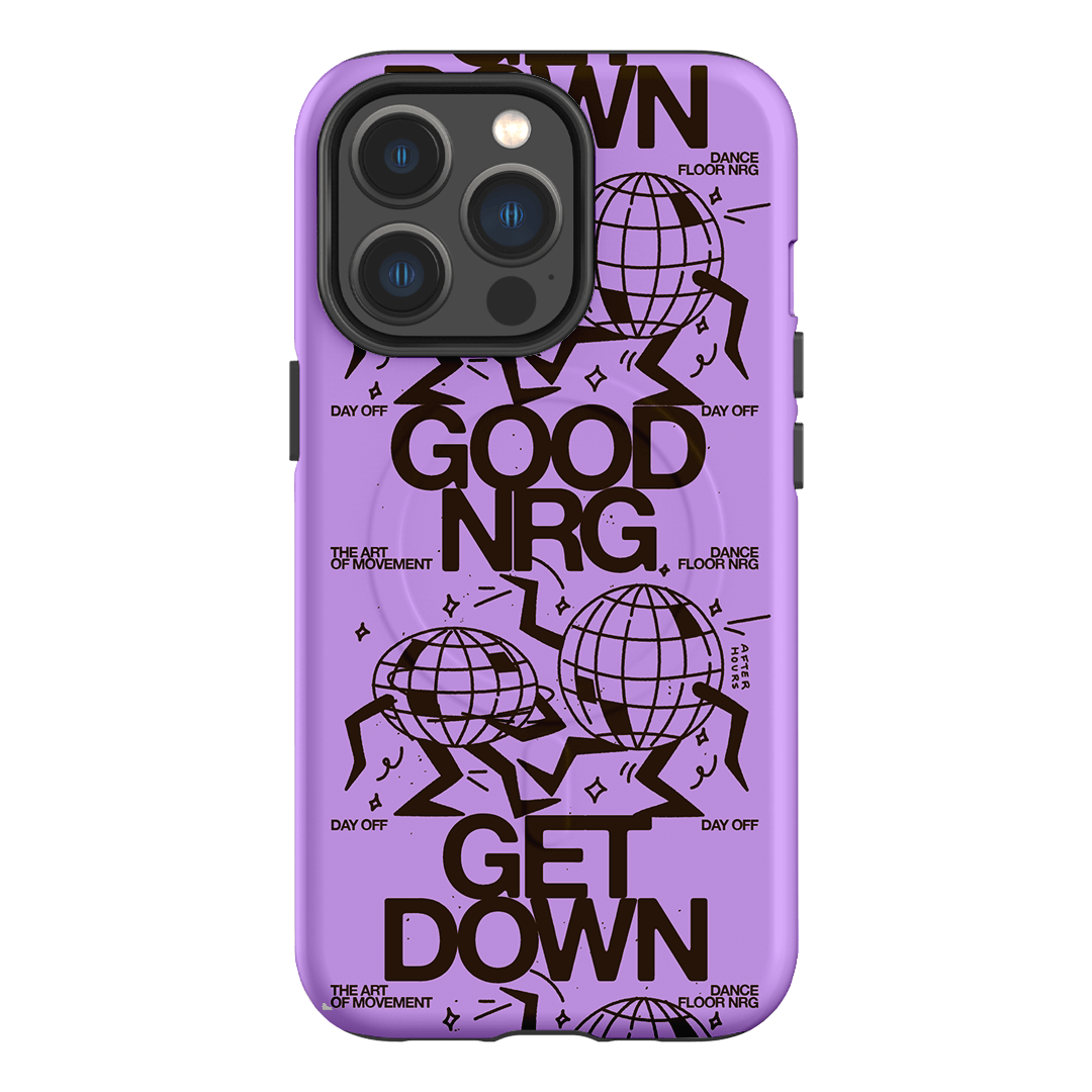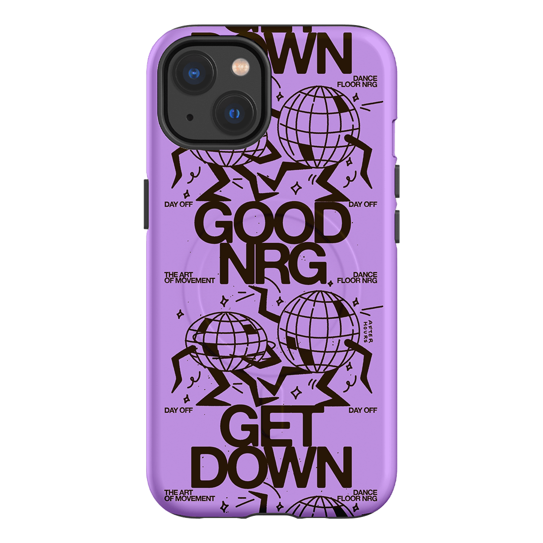 Enter your rave era. The Good Energy Case embraces high vibrations and good energy, tacking inspiration from house rave posters of the 90s. Everyone deserves a little boogie on their day off, now captured forever on your phone. Get lost in the lights and music, smoke and mirrors, purple haze. Available for iPhone, Samsung Galaxy and Google Pixel phones.