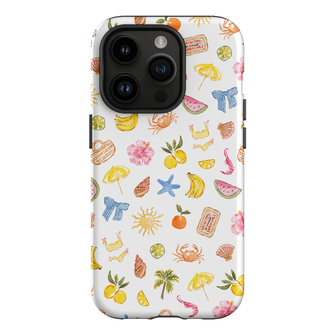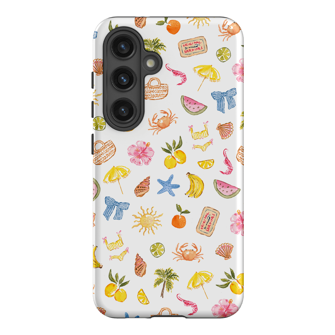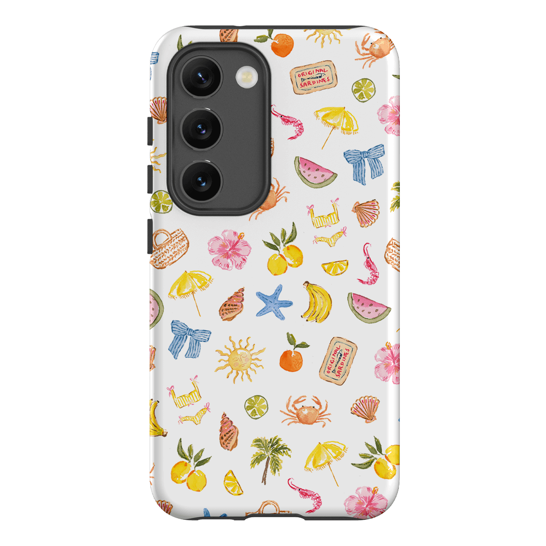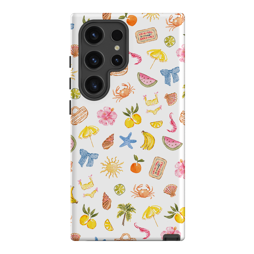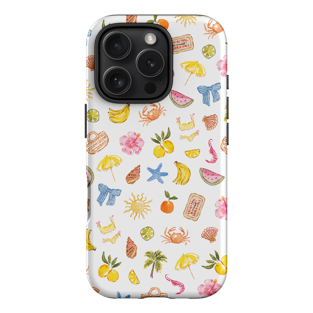 Bring the vibrant spirit of coastal living to your everyday life with the Summer Icons phone case by artist Cass Deller. This stunning design features a delightful mix of seaside-inspired icons, including colourful fruits, playful sea creatures, chic bikinis, delicate shells, and swaying palm trees, all beautifully arranged on a crisp white background.
