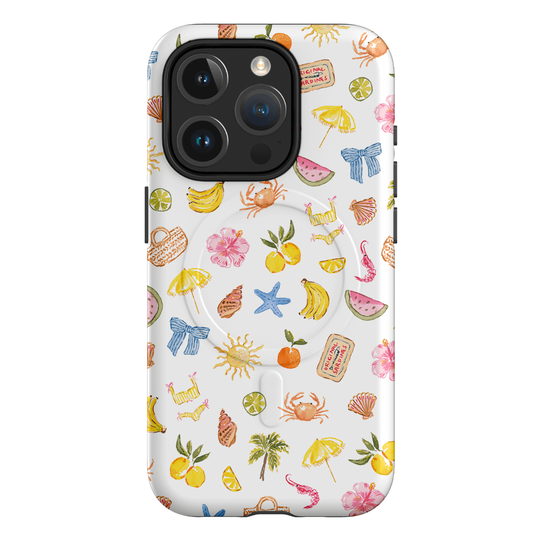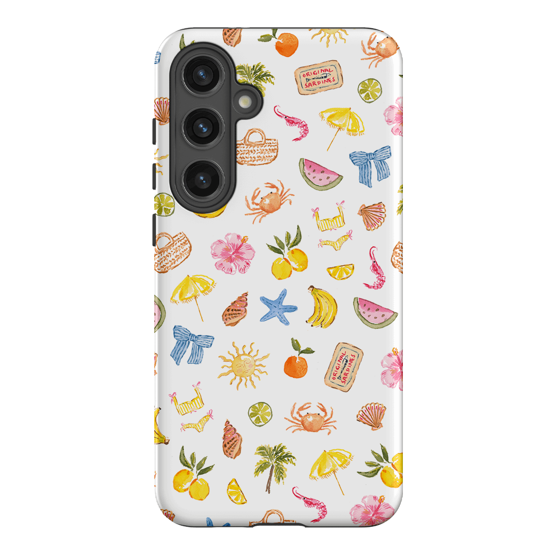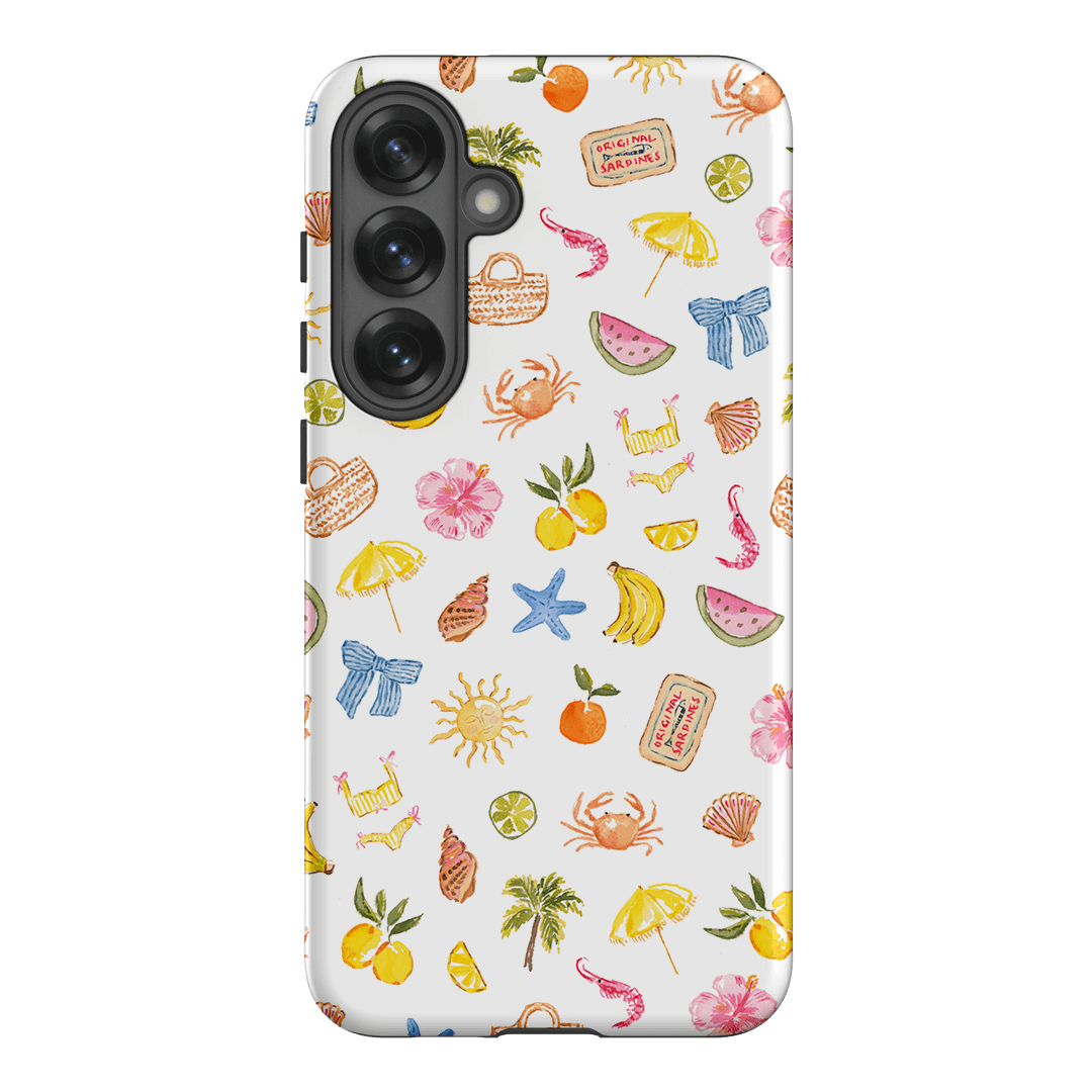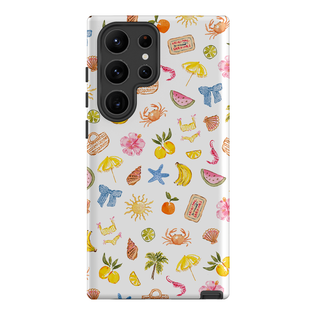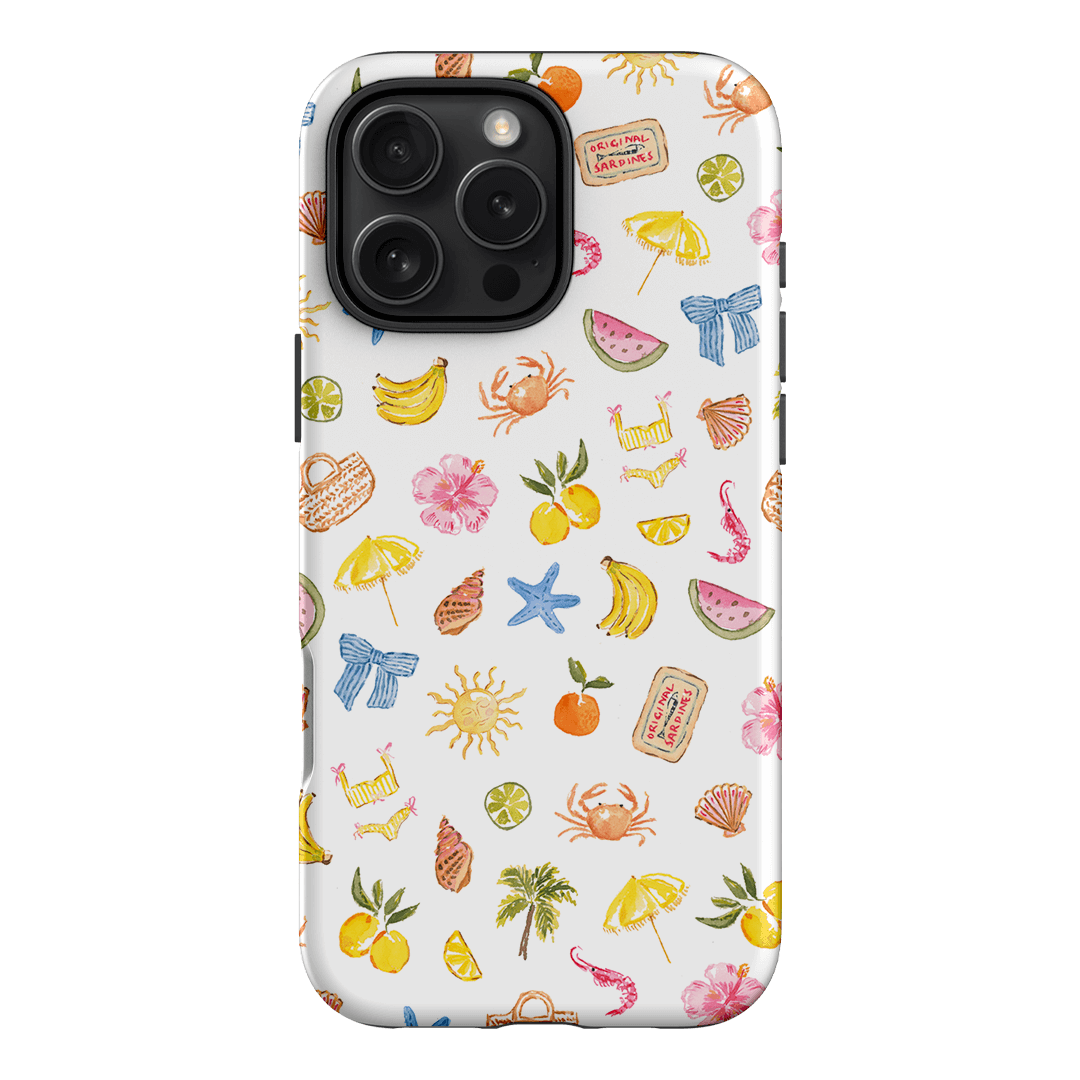 Bring the vibrant spirit of coastal living to your everyday life with the Summer Icons phone case by artist Cass Deller. This stunning design features a delightful mix of seaside-inspired icons, including colourful fruits, playful sea creatures, chic bikinis, delicate shells, and swaying palm trees, all beautifully arranged on a crisp white background.