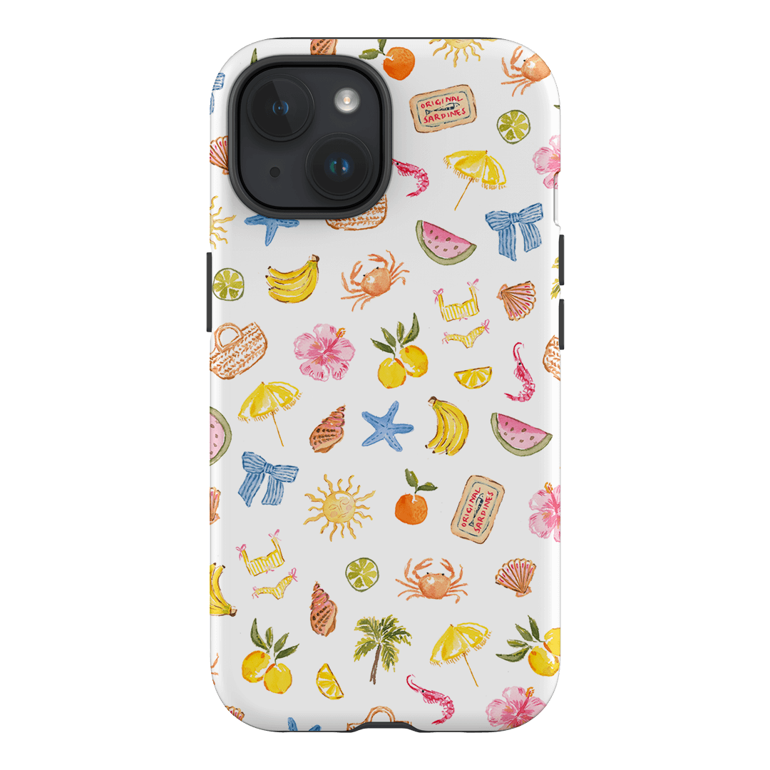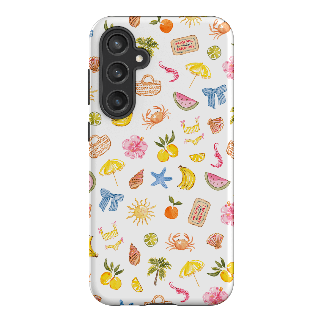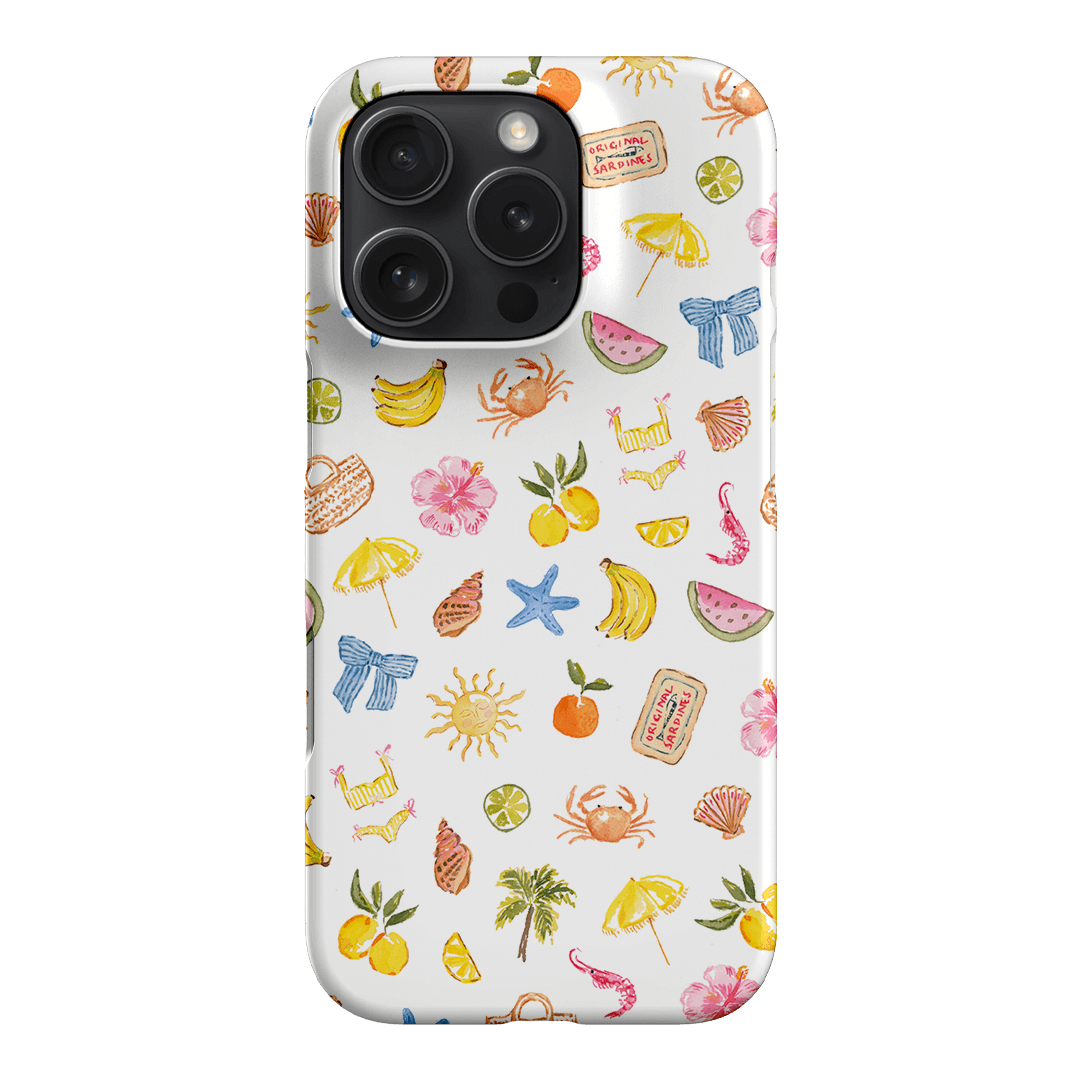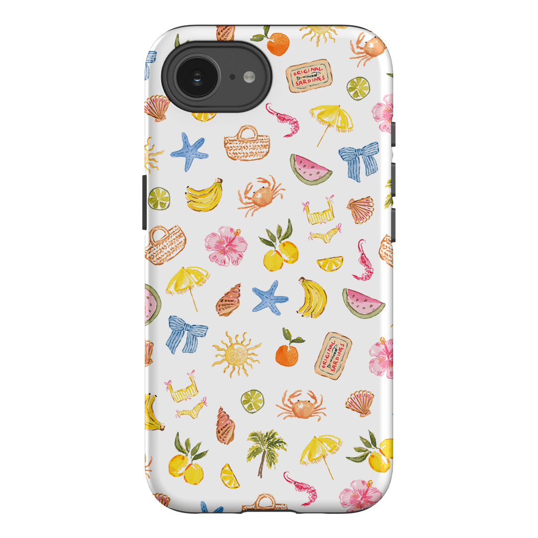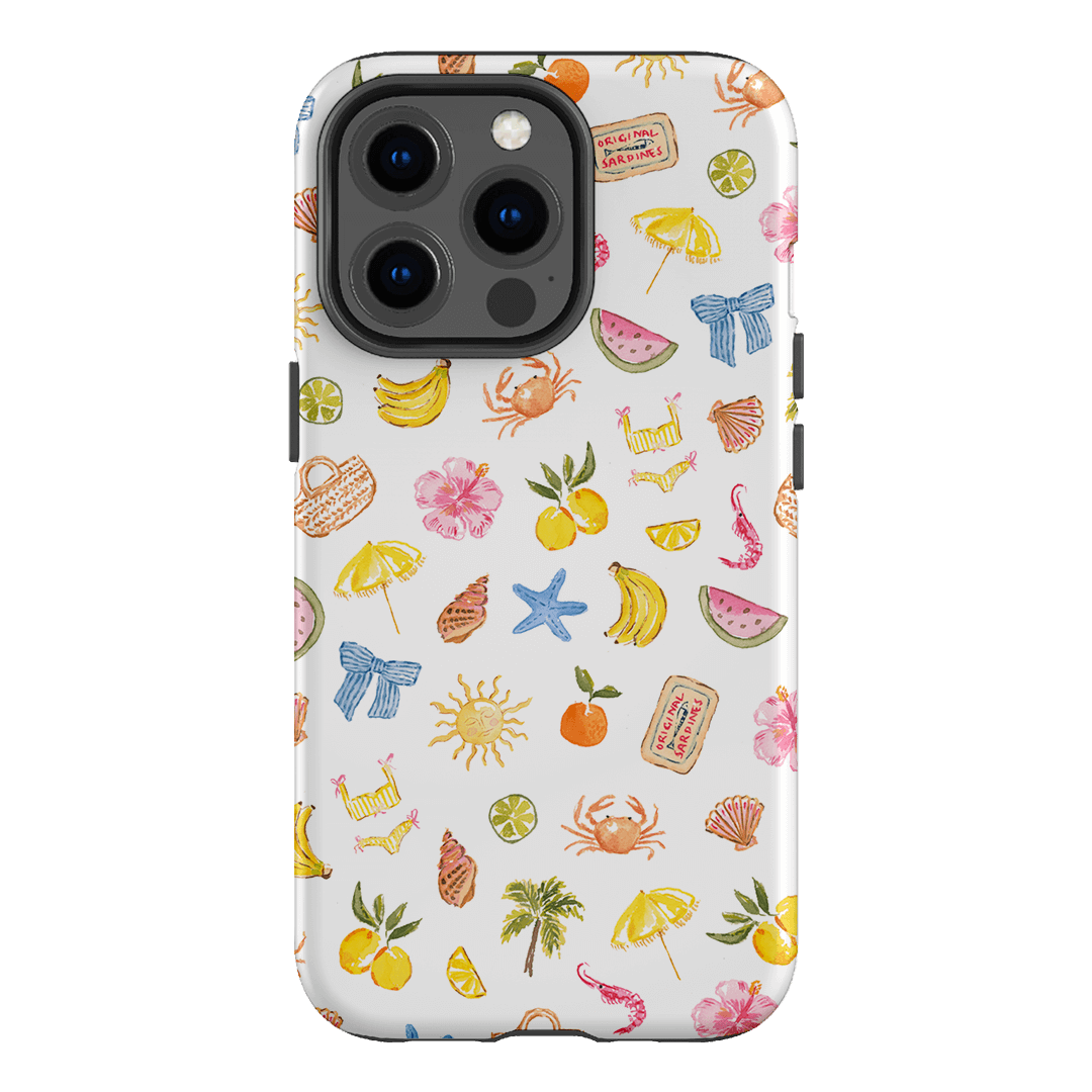 Bring the vibrant spirit of coastal living to your everyday life with the Summer Icons phone case by artist Cass Deller. This stunning design features a delightful mix of seaside-inspired icons, including colourful fruits, playful sea creatures, chic bikinis, delicate shells, and swaying palm trees, all beautifully arranged on a crisp white background.