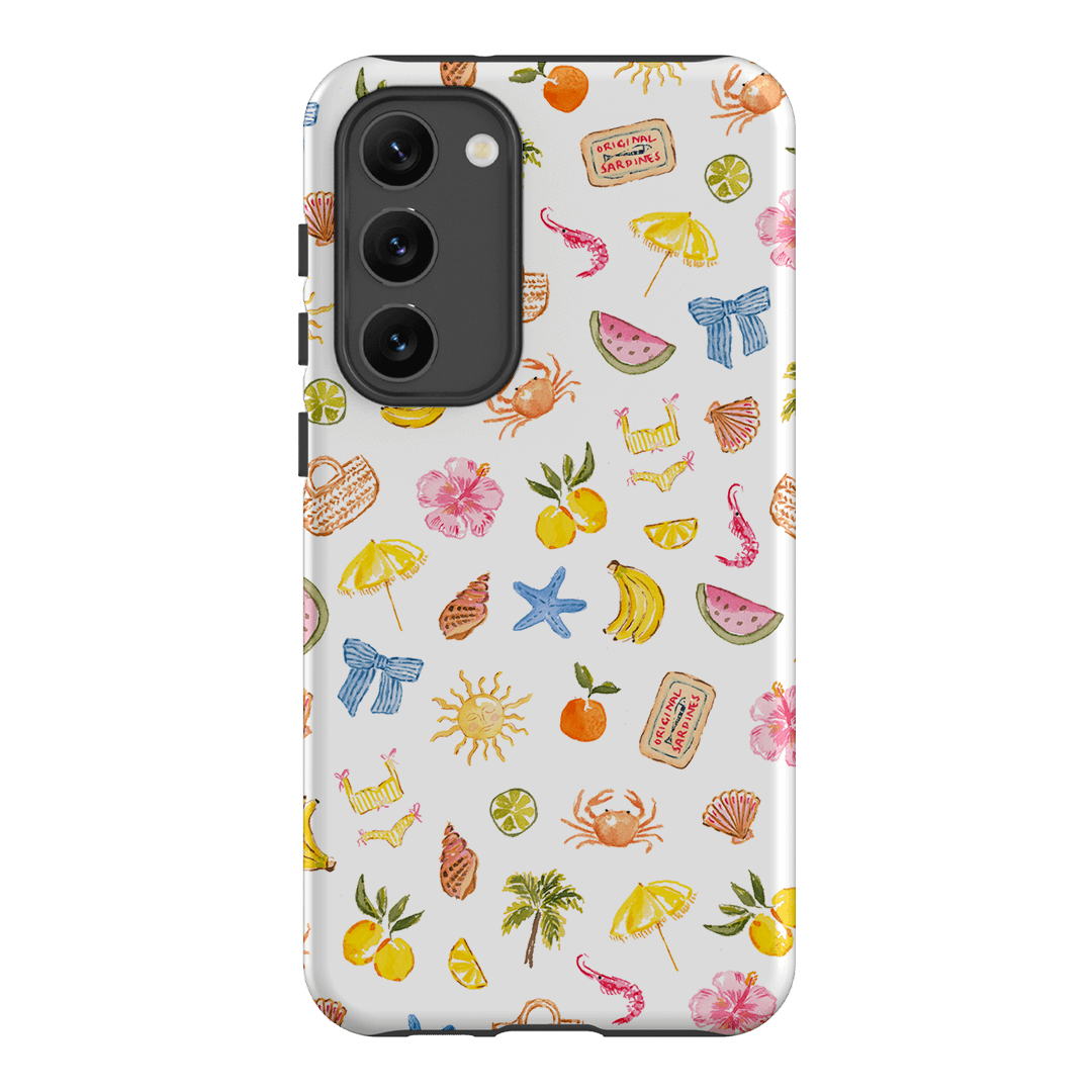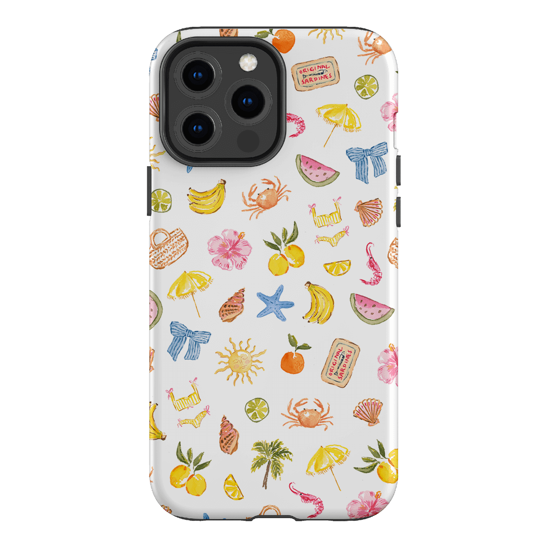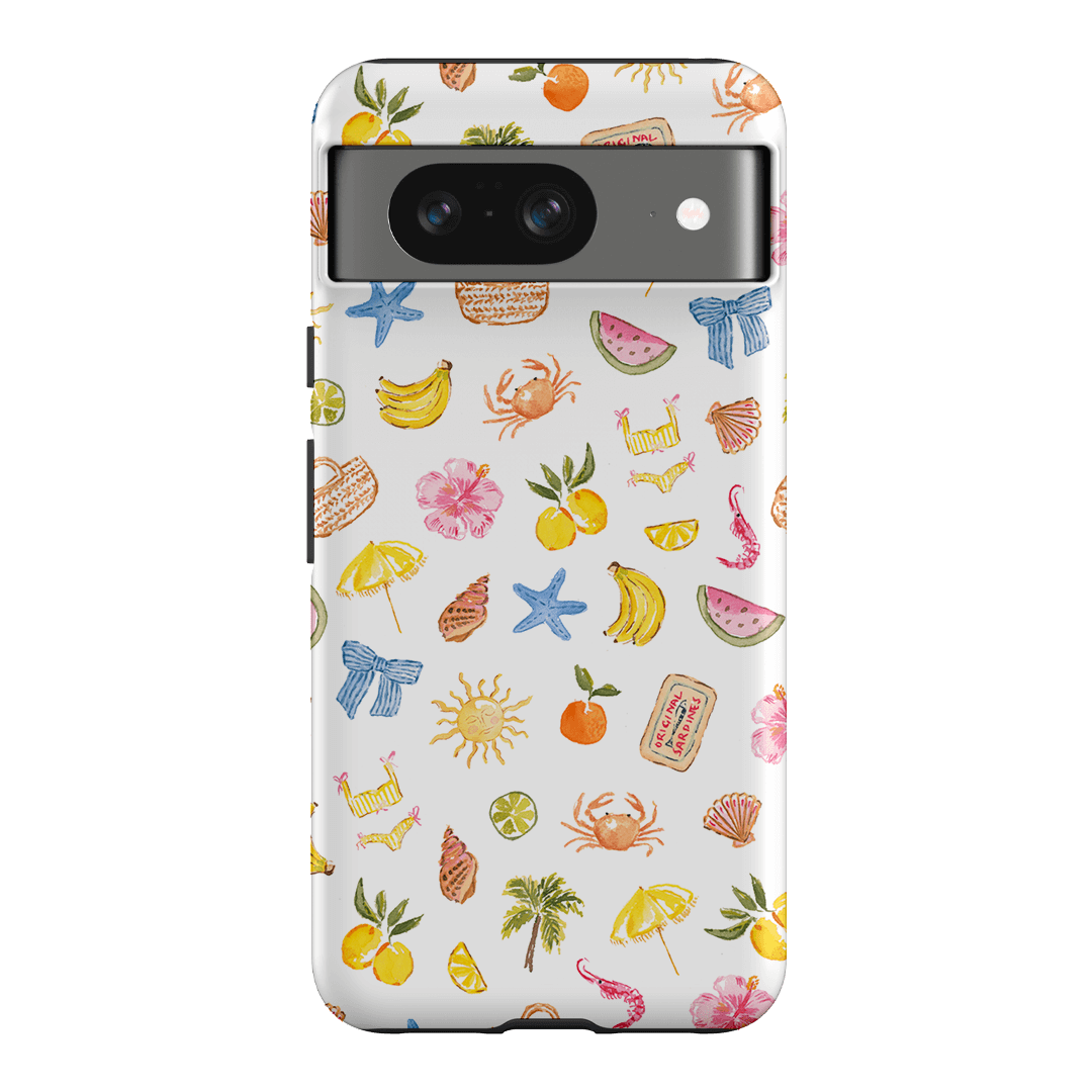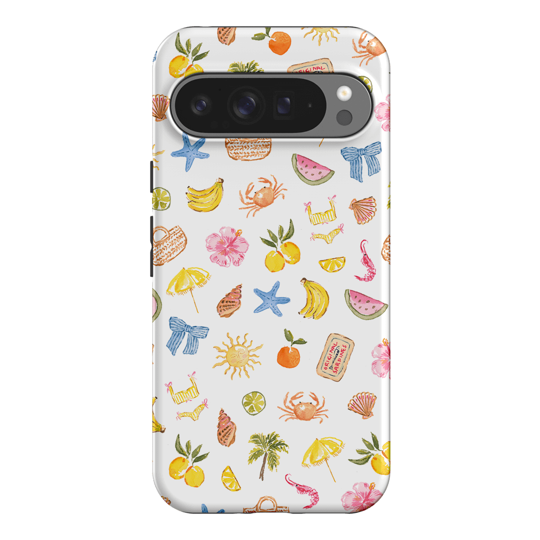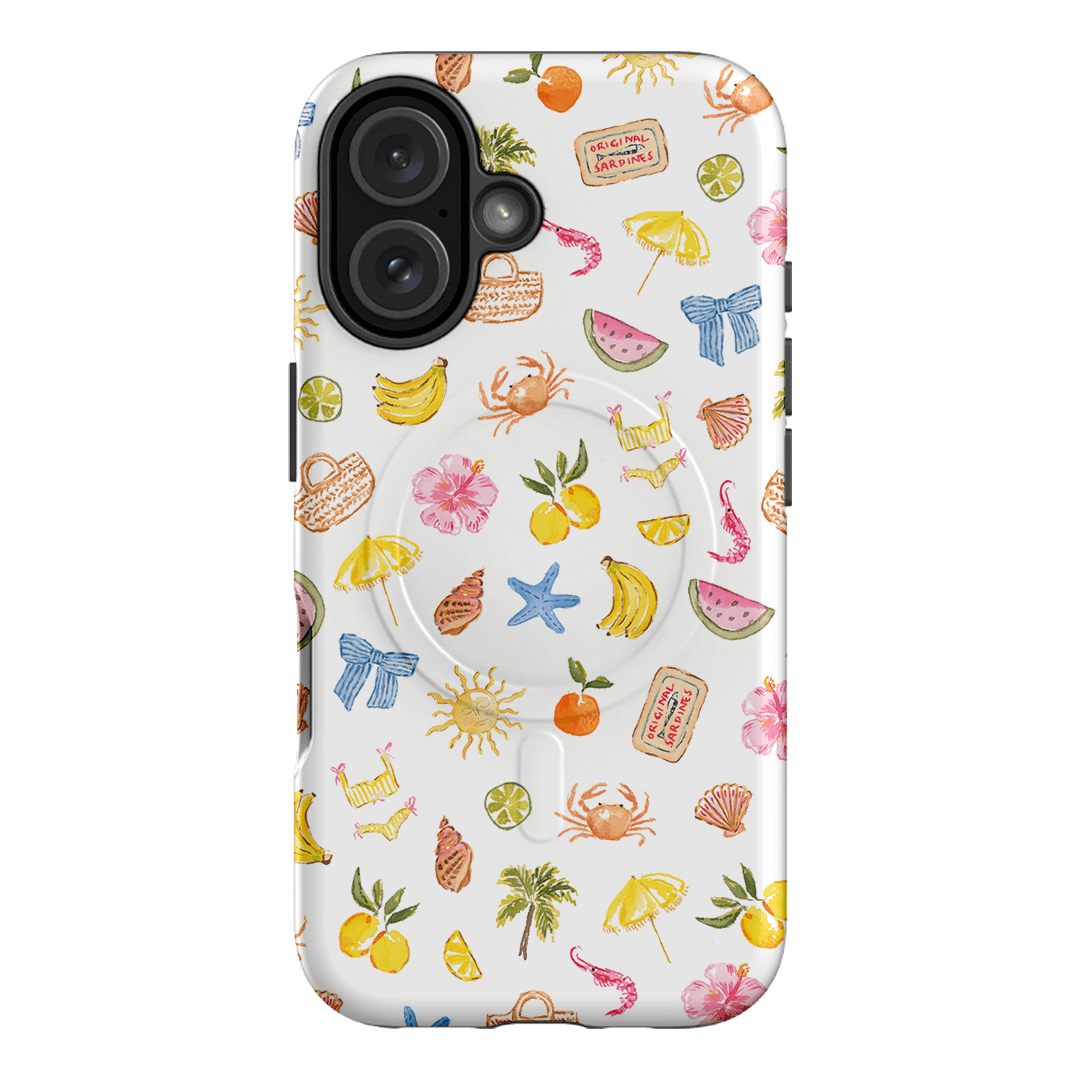 Bring the vibrant spirit of coastal living to your everyday life with the Summer Icons phone case by artist Cass Deller. This stunning design features a delightful mix of seaside-inspired icons, including colourful fruits, playful sea creatures, chic bikinis, delicate shells, and swaying palm trees, all beautifully arranged on a crisp white background.