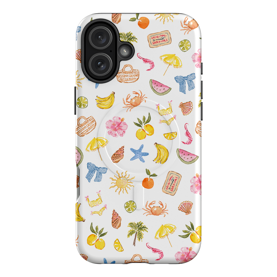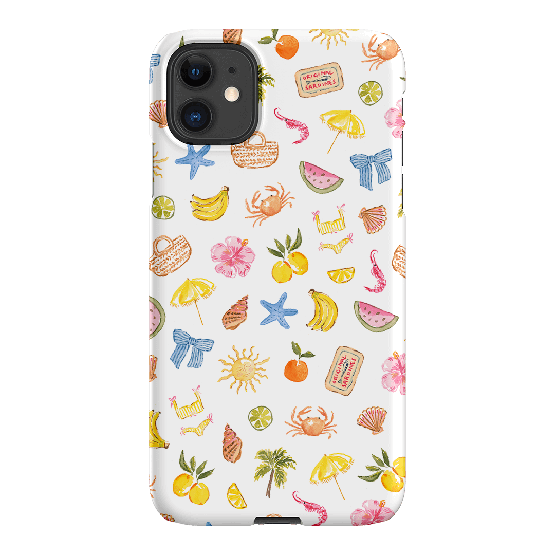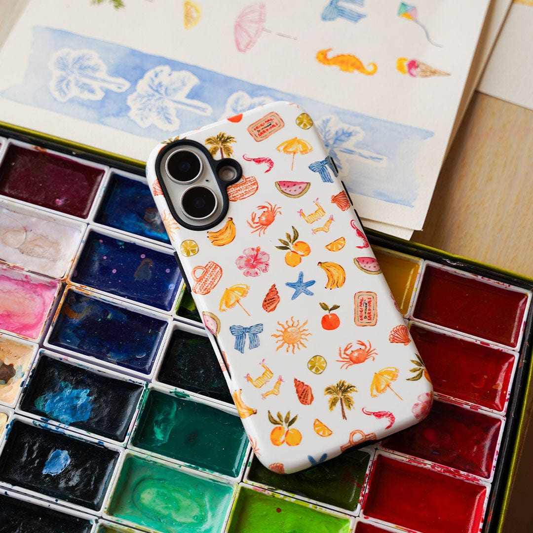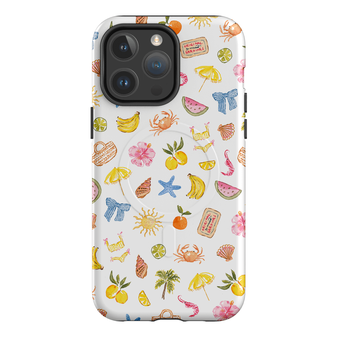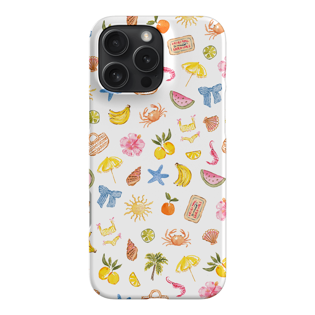Bring the vibrant spirit of coastal living to your everyday life with the Summer Icons phone case by artist Cass Deller. This stunning design features a delightful mix of seaside-inspired icons, including colourful fruits, playful sea creatures, chic bikinis, delicate shells, and swaying palm trees, all beautifully arranged on a crisp white background.