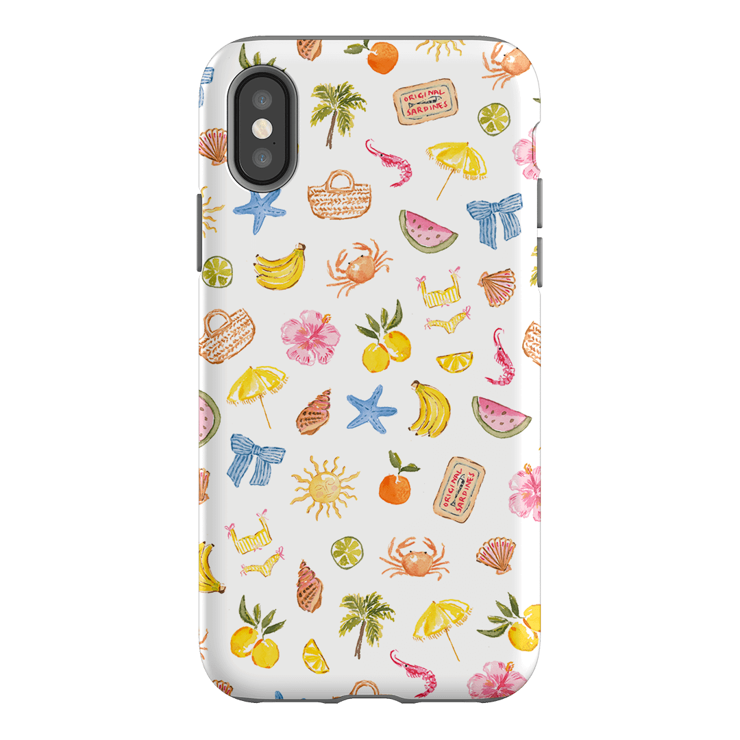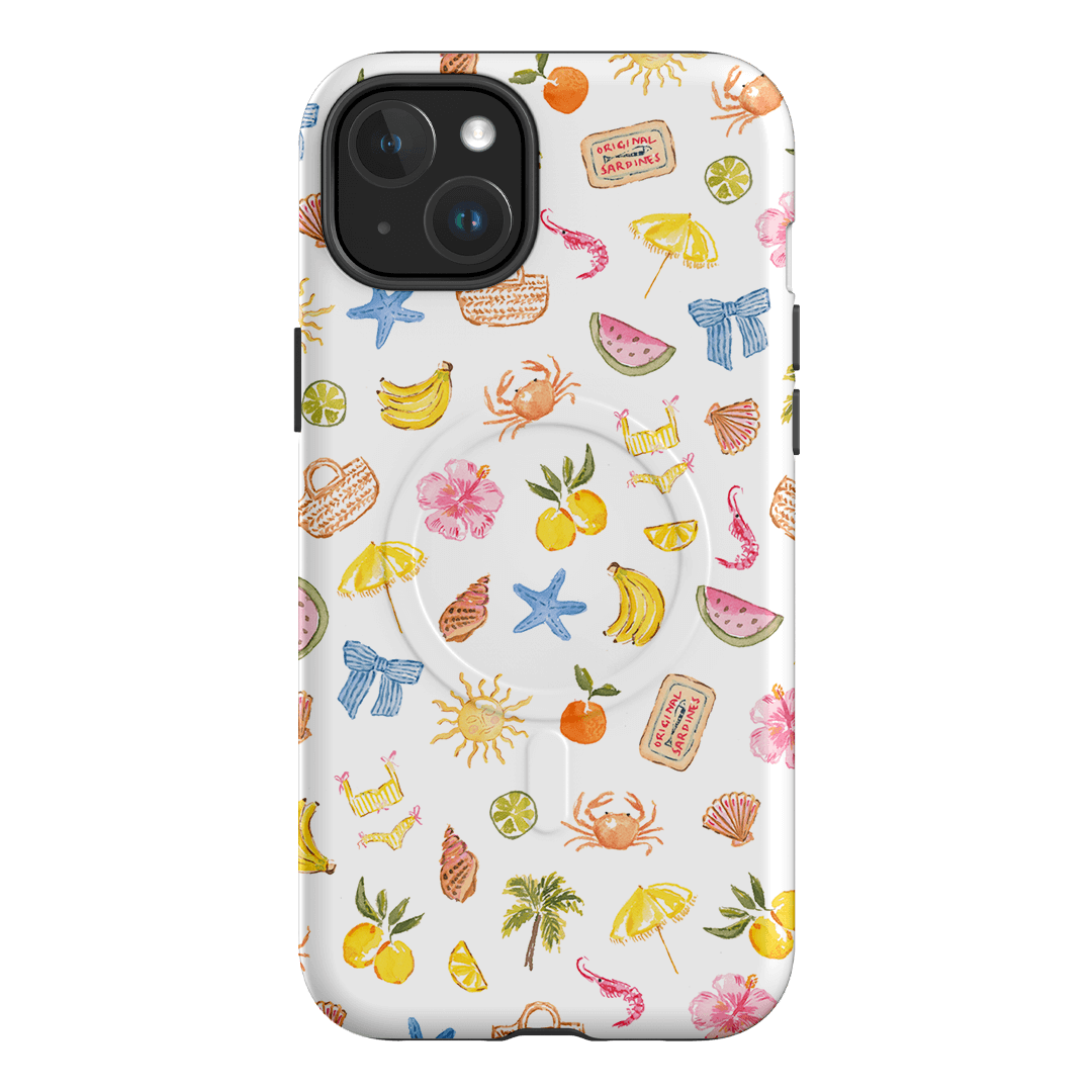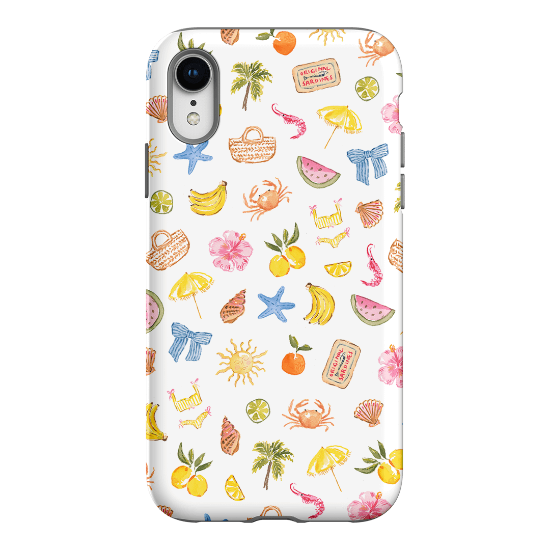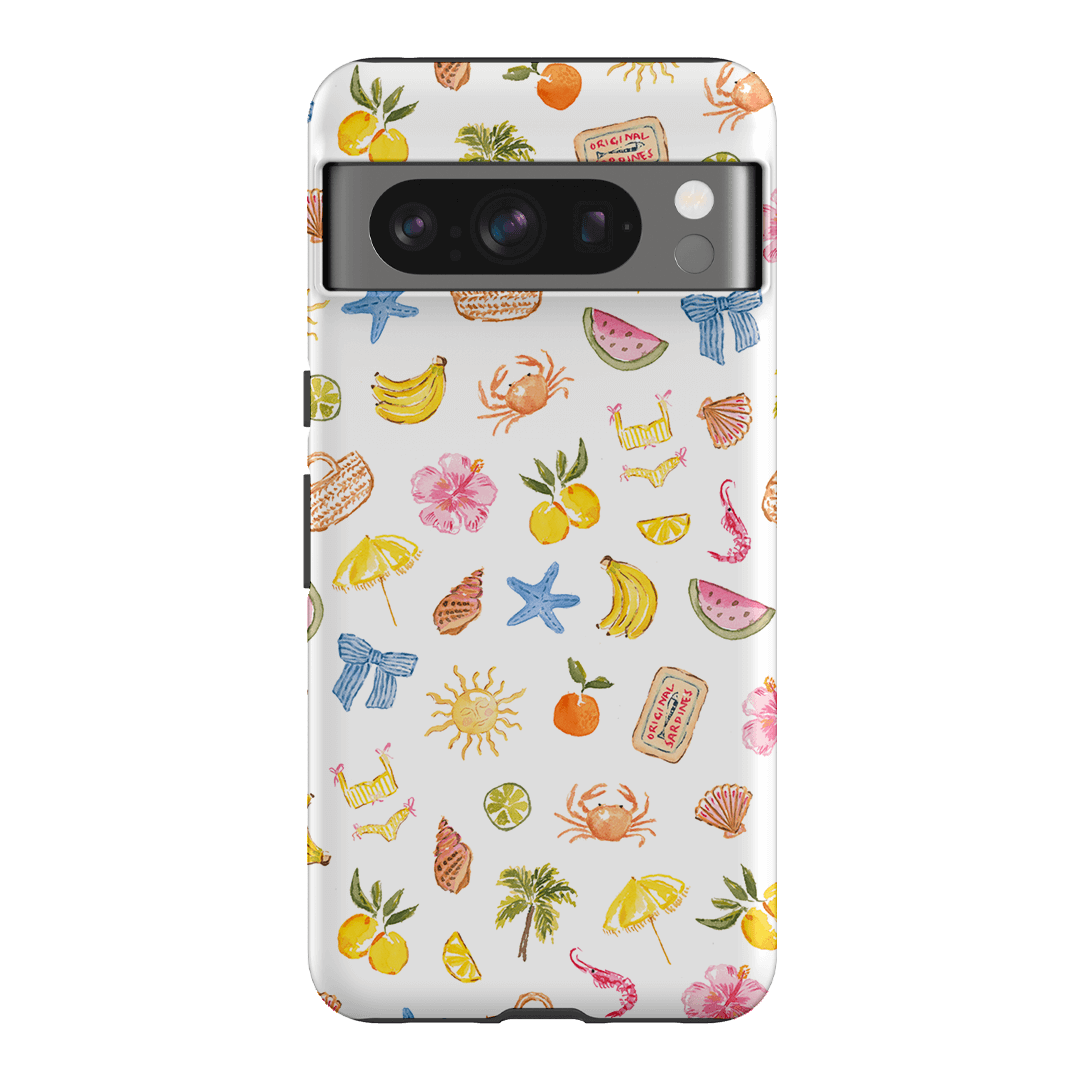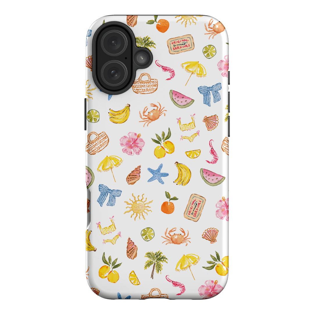 Bring the vibrant spirit of coastal living to your everyday life with the Summer Icons phone case by artist Cass Deller. This stunning design features a delightful mix of seaside-inspired icons, including colourful fruits, playful sea creatures, chic bikinis, delicate shells, and swaying palm trees, all beautifully arranged on a crisp white background.