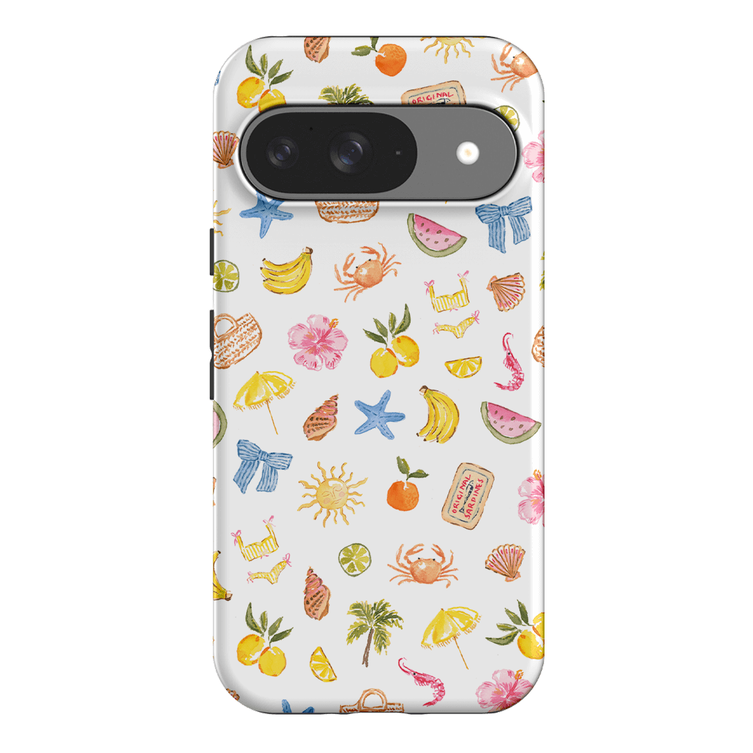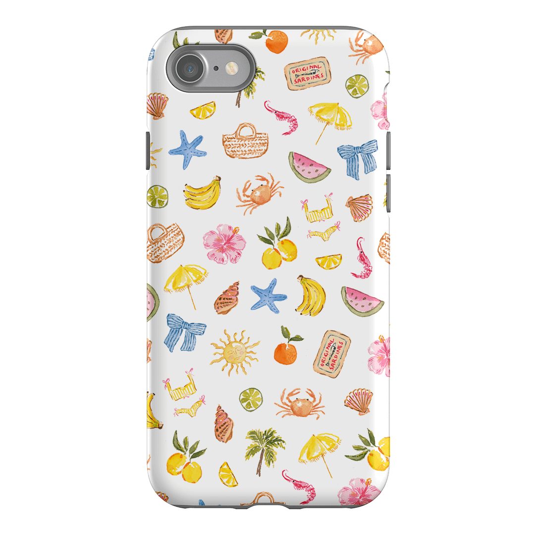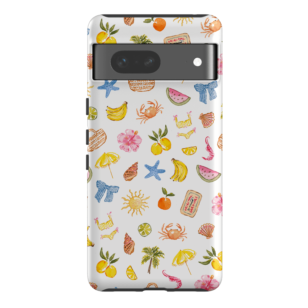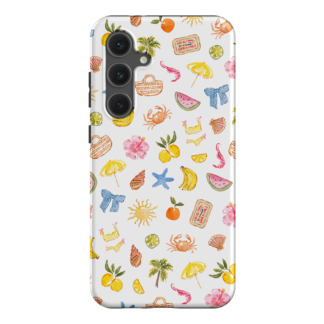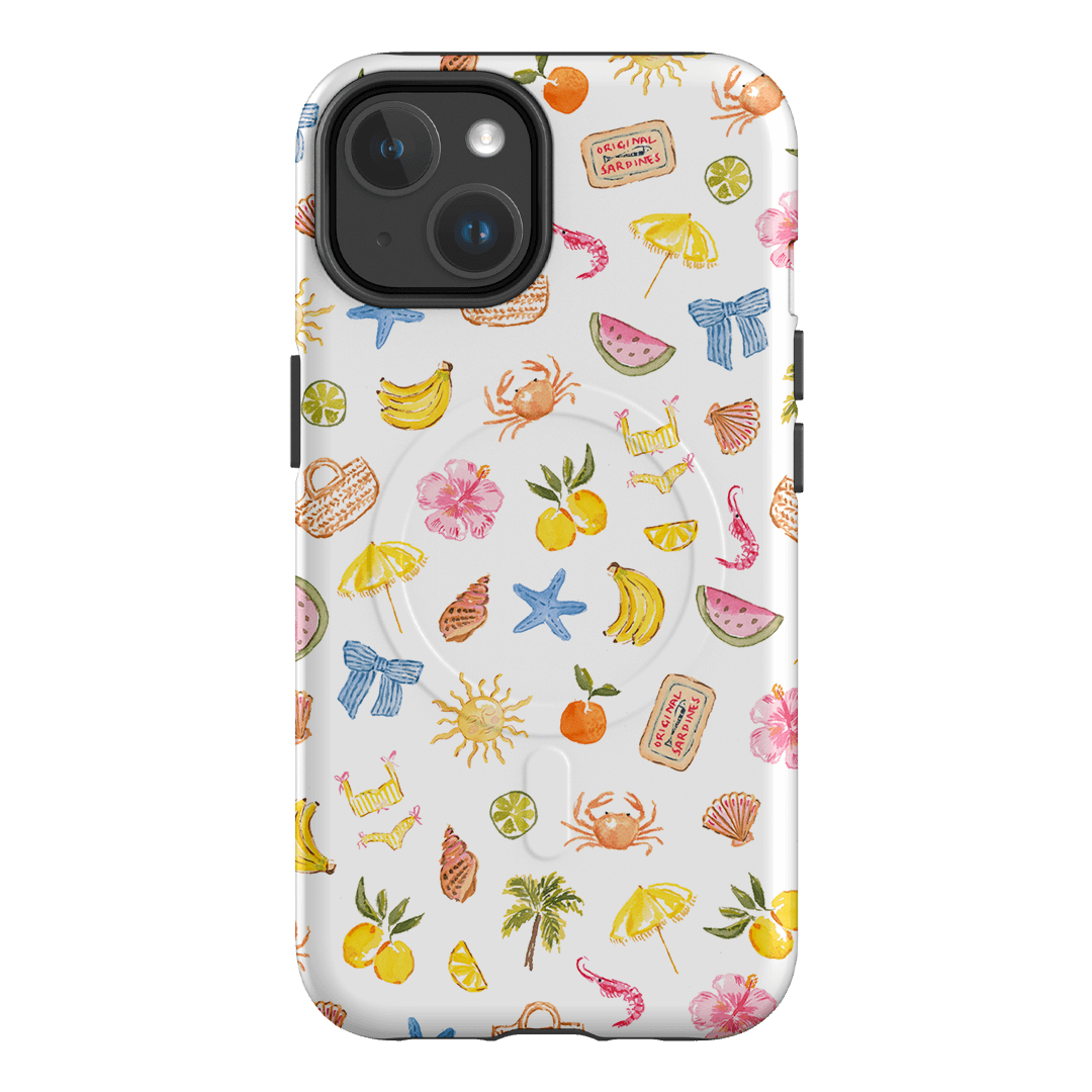 Bring the vibrant spirit of coastal living to your everyday life with the Summer Icons phone case by artist Cass Deller. This stunning design features a delightful mix of seaside-inspired icons, including colourful fruits, playful sea creatures, chic bikinis, delicate shells, and swaying palm trees, all beautifully arranged on a crisp white background.