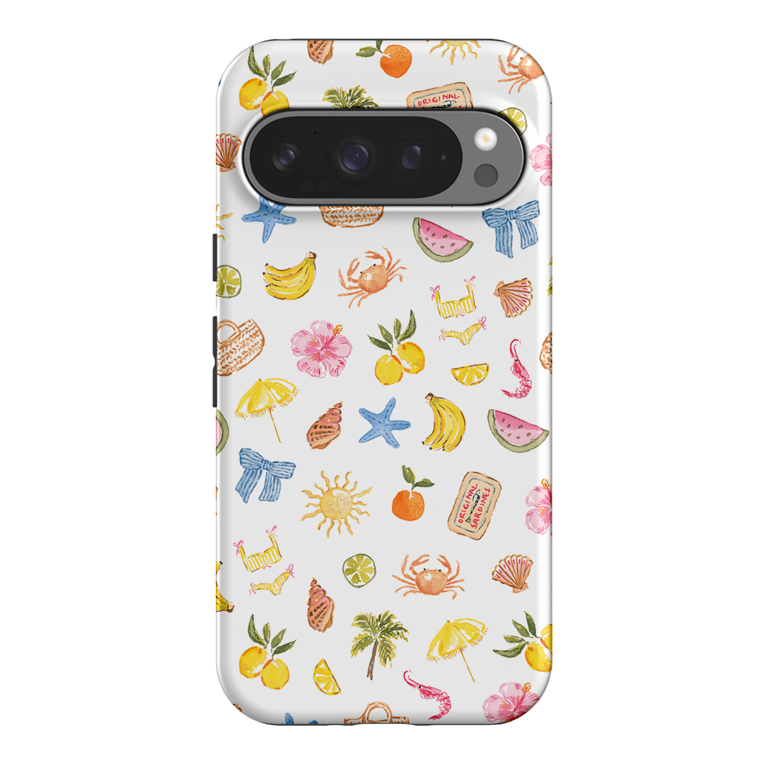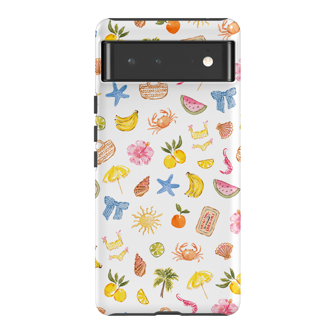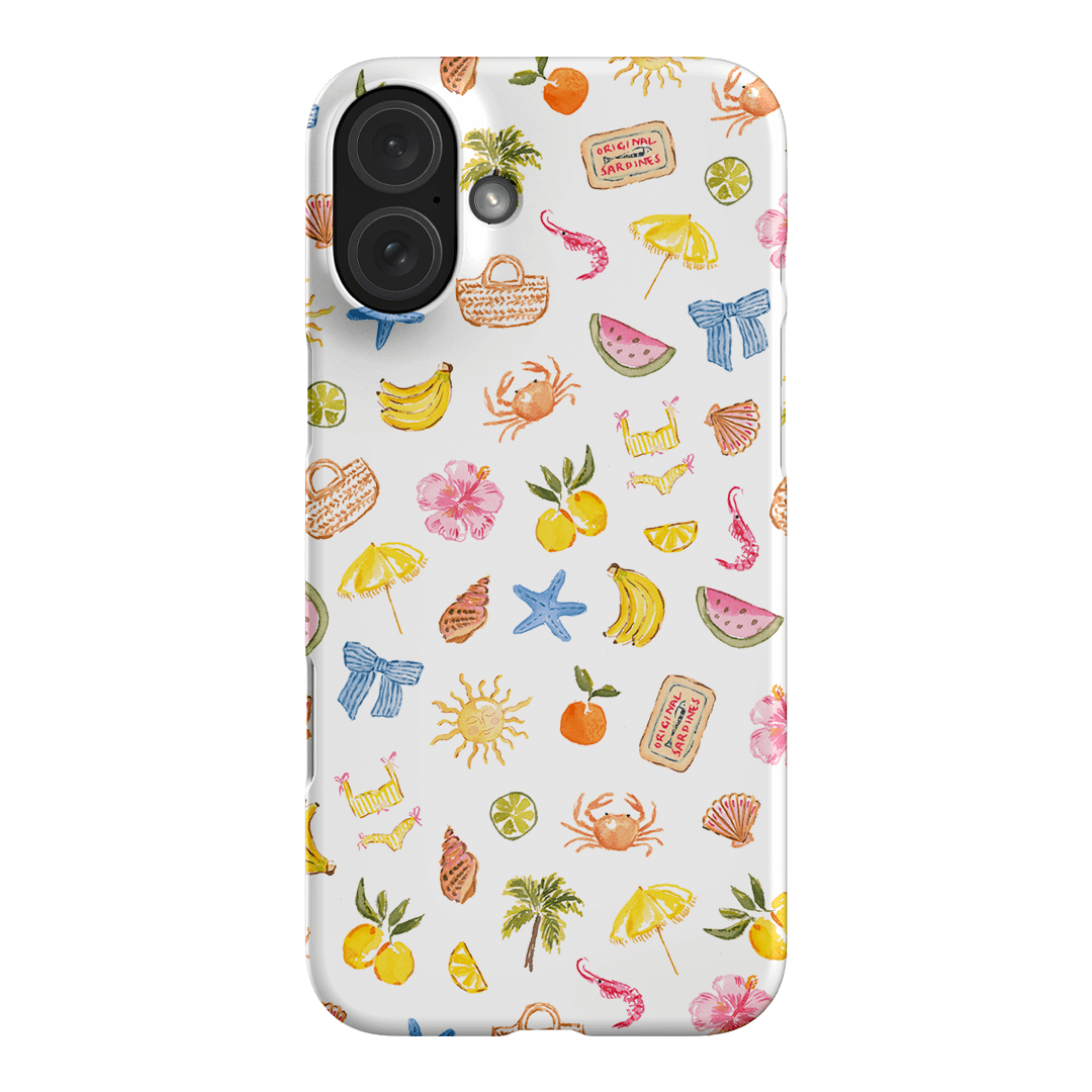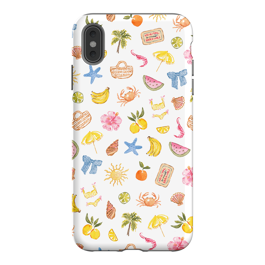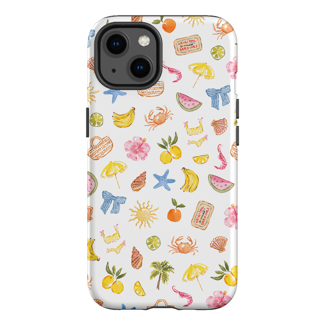 Bring the vibrant spirit of coastal living to your everyday life with the Summer Icons phone case by artist Cass Deller. This stunning design features a delightful mix of seaside-inspired icons, including colourful fruits, playful sea creatures, chic bikinis, delicate shells, and swaying palm trees, all beautifully arranged on a crisp white background.