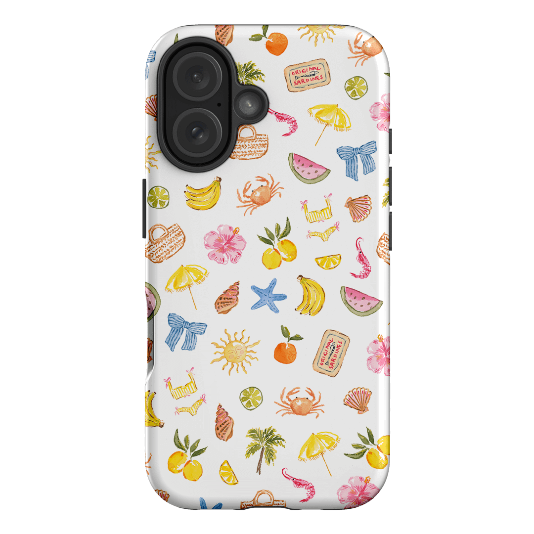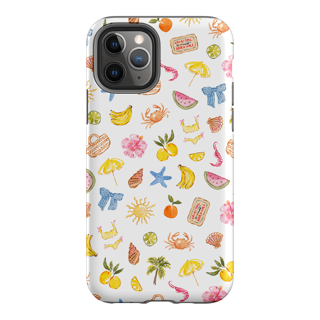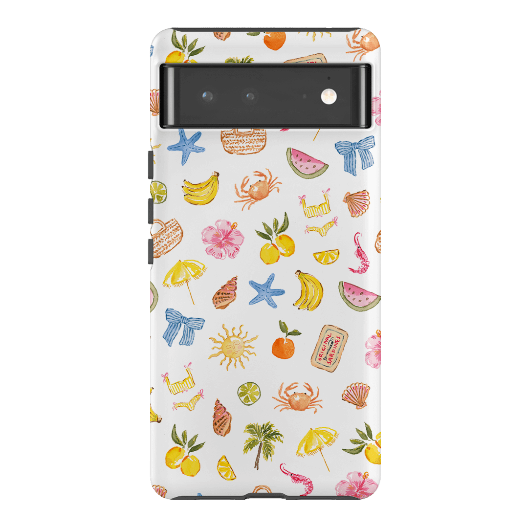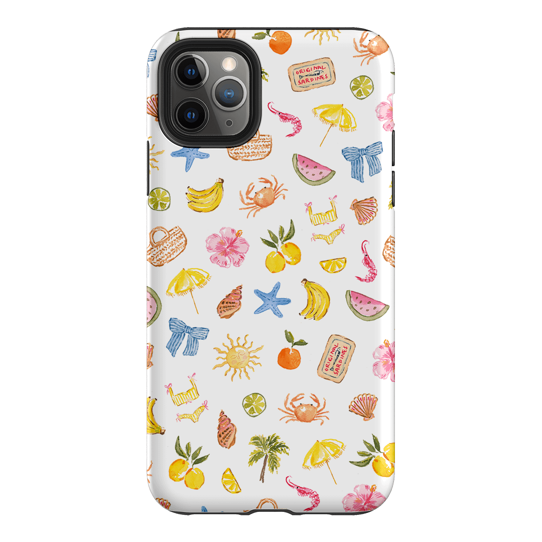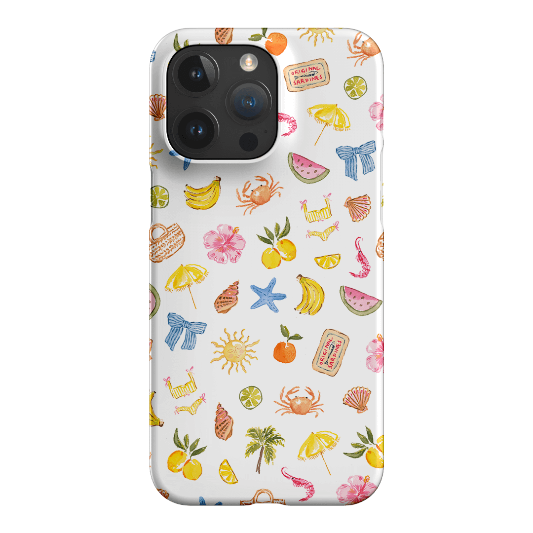 Bring the vibrant spirit of coastal living to your everyday life with the Summer Icons phone case by artist Cass Deller. This stunning design features a delightful mix of seaside-inspired icons, including colourful fruits, playful sea creatures, chic bikinis, delicate shells, and swaying palm trees, all beautifully arranged on a crisp white background.