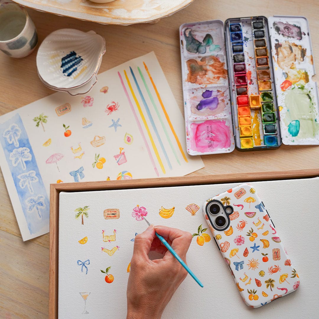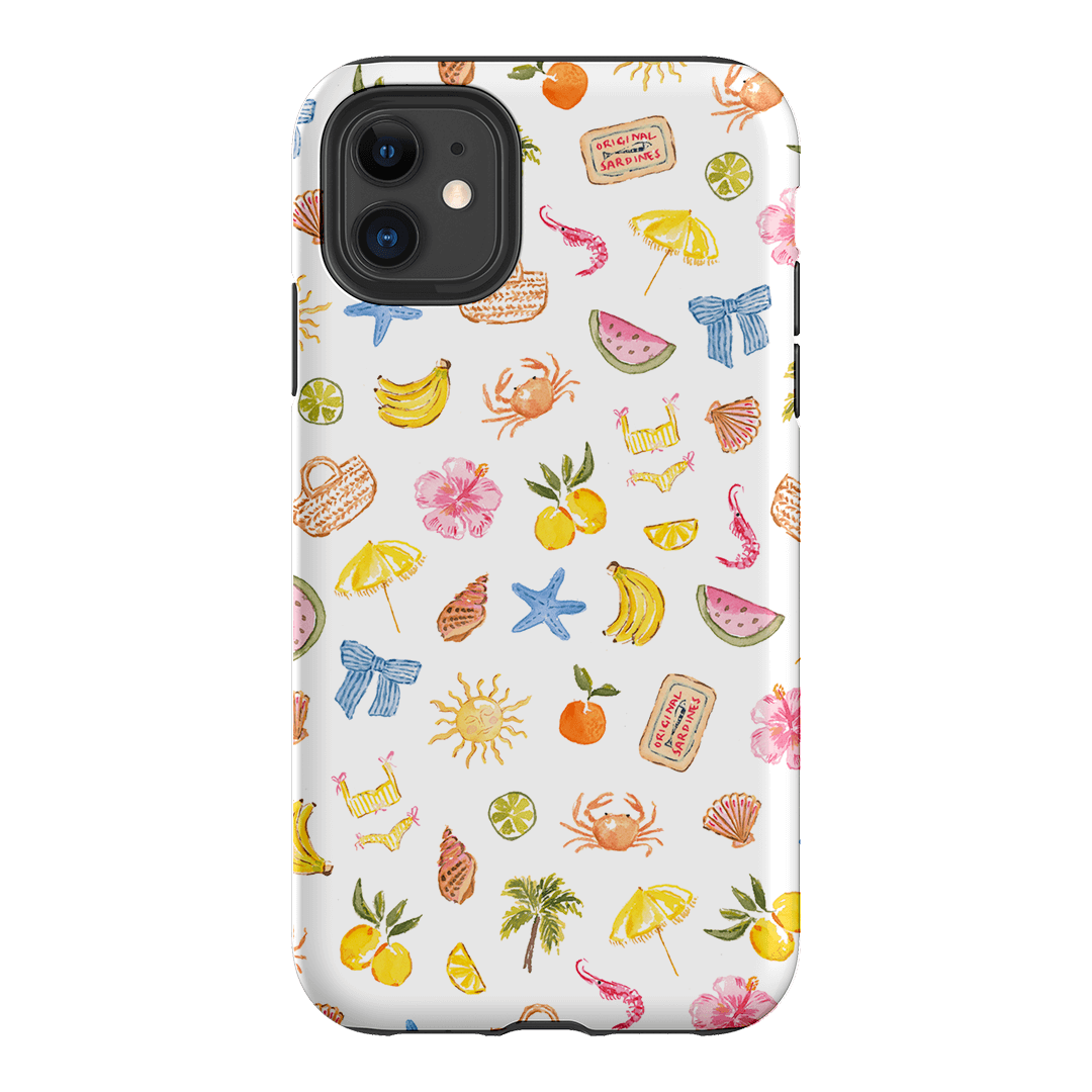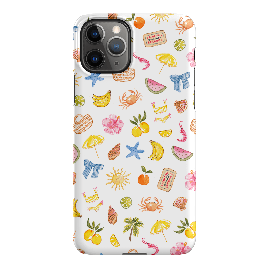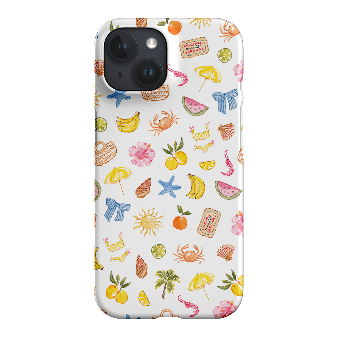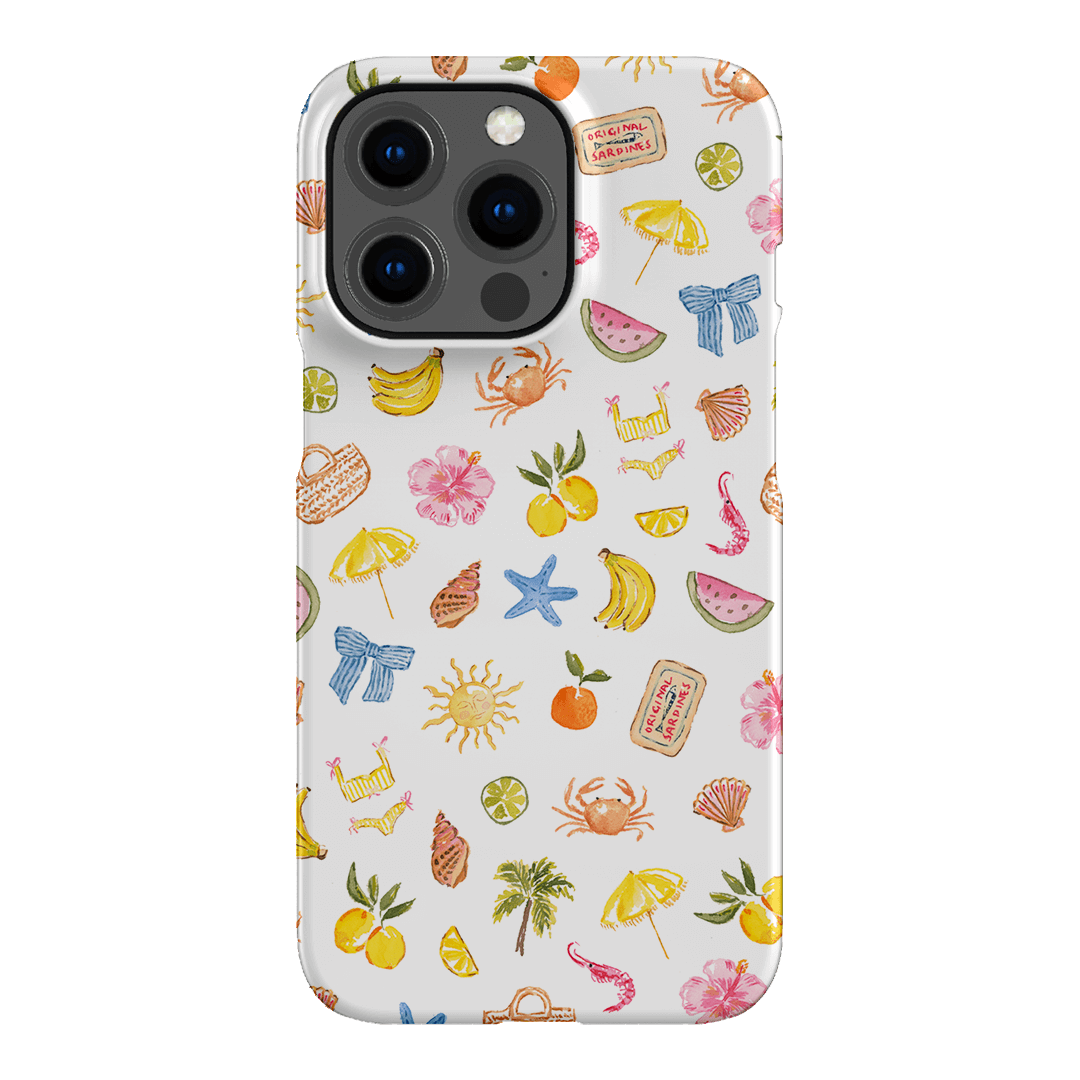 Bring the vibrant spirit of coastal living to your everyday life with the Summer Icons phone case by artist Cass Deller. This stunning design features a delightful mix of seaside-inspired icons, including colourful fruits, playful sea creatures, chic bikinis, delicate shells, and swaying palm trees, all beautifully arranged on a crisp white background.