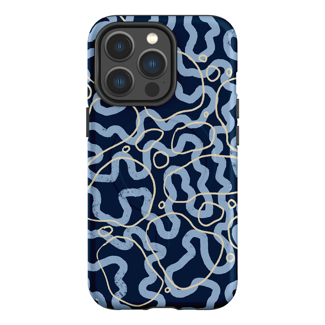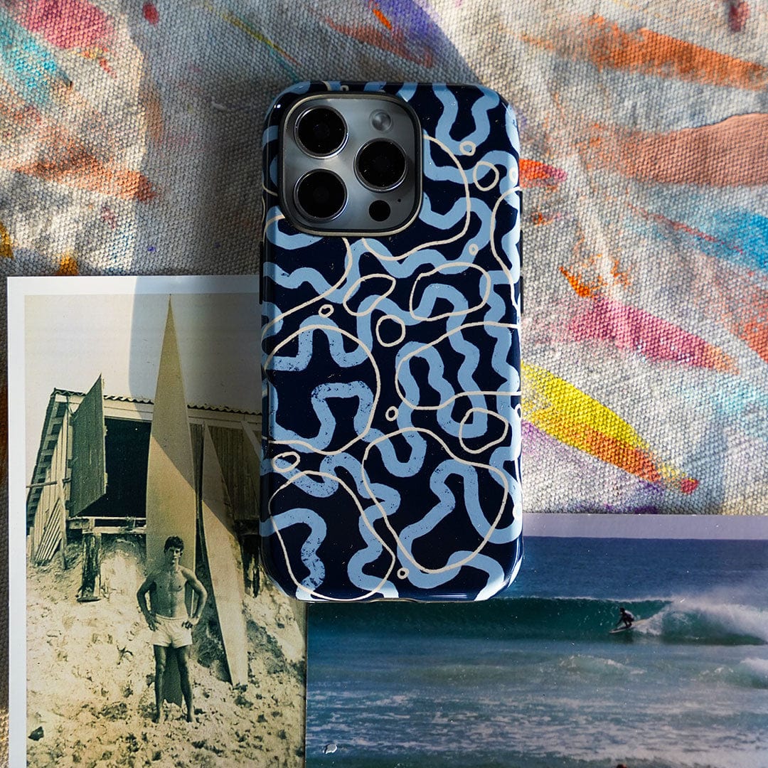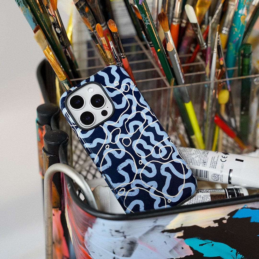 Protect your phone in style with this stunning phone case featuring original artwork by Ryhia Dank. This captivating design blends dark and light blue abstract lines and shapes, representing the harmonious meeting of saltwater and freshwater. Cream-thin line details add a delicate touch, enhancing the flowing composition that evokes the beauty of nature's contrasts.